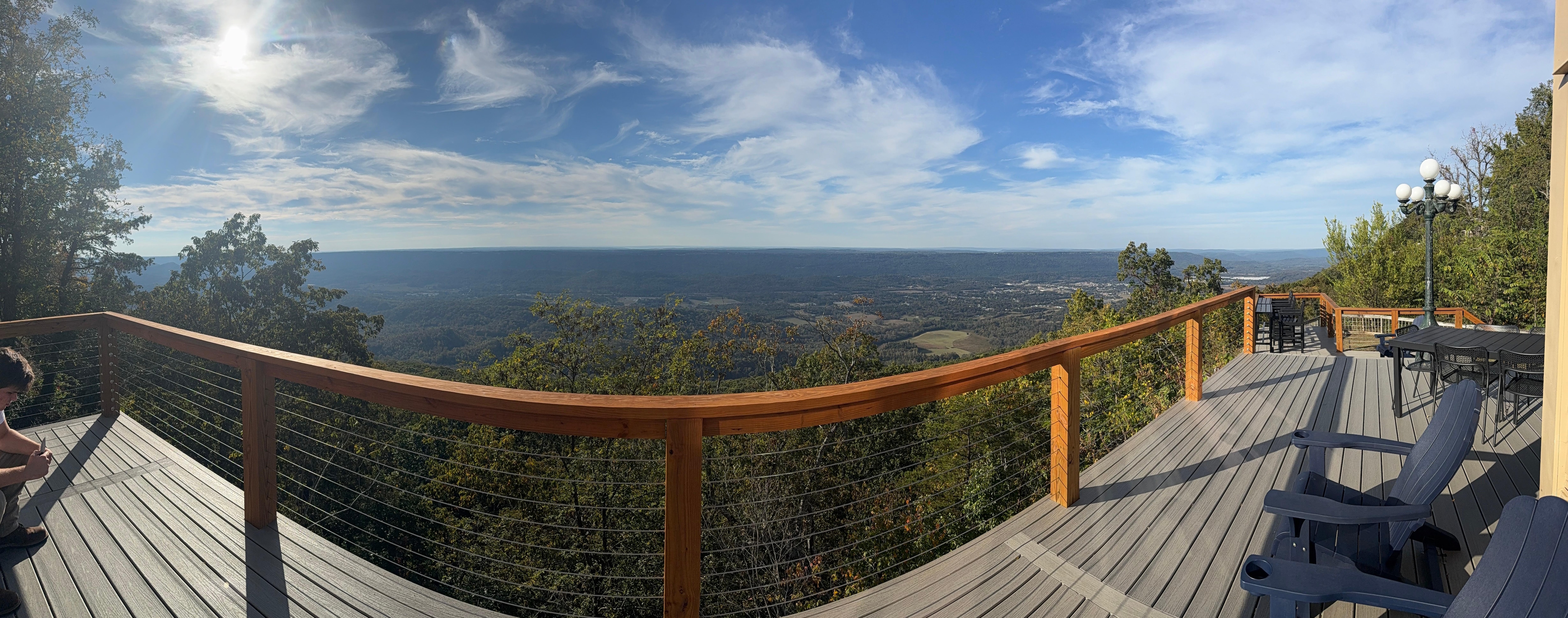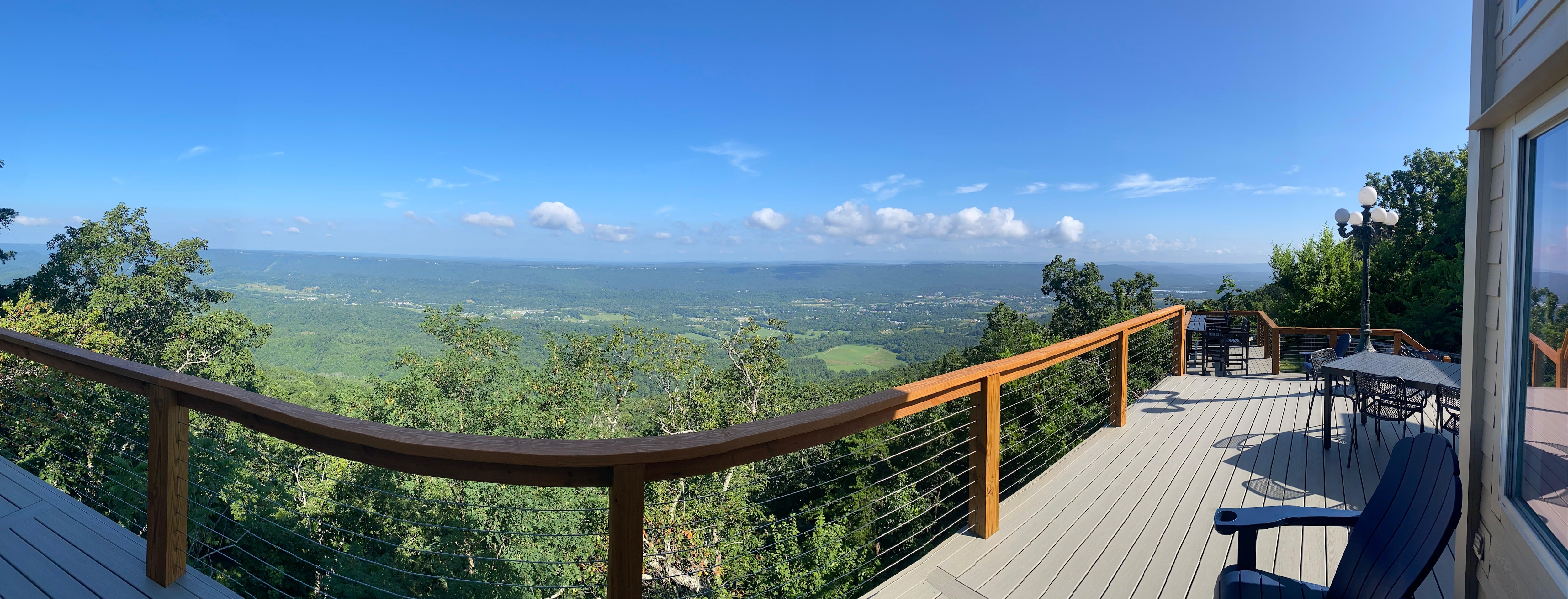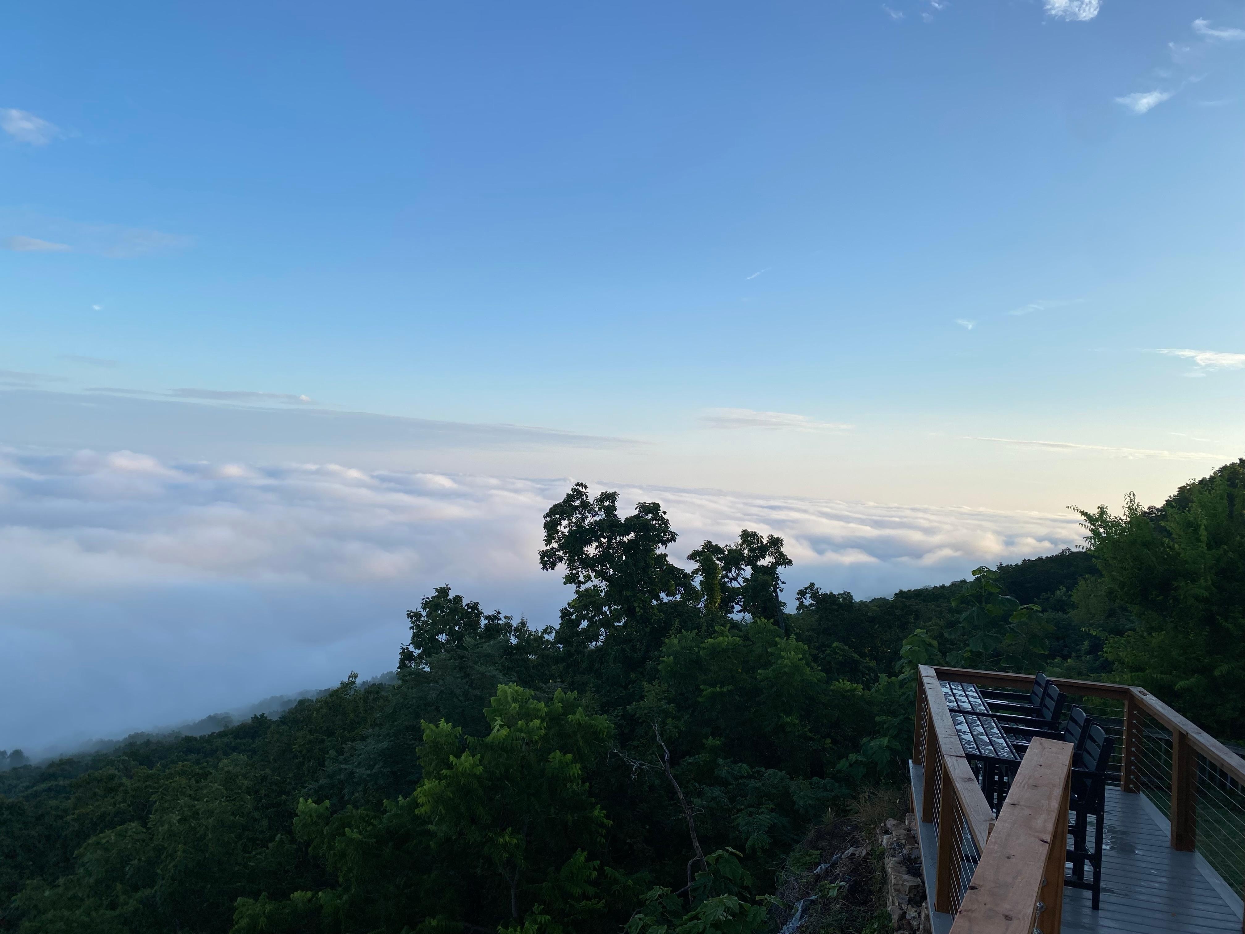 Outside, Adirondack chairs, an outdoor dining table, and a cliffside bar table with four chairs offer the ability to enjoy the large deck, which has incredible views of three states, with the clouds and sky keeping you mesmerized while they shift continuously from fog to clear to cloudy skies.