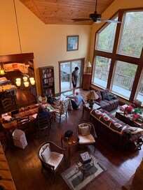 La gran sala soleada es un lugar de encuentro perfecto para los amigos y la familia, con su piso a techo ventanas que dan al sur, chimenea de piedra (gas) y el acceso a la plaza cubierta de pies 600. La zona de loft cuenta con un '' HDTV 51 con reproductor de Blu-ray, junto con una colección de DVD, ordenador con acceso a internet, y es perfecto para jugar uno de los muchos juegos que ofrecemos. WiFi gratuito disponible también. Con más de 20 'de balcón con vistas a la gran sala, el loft ofrece una sensación de privacidad, manteniendo una conexión con el resto de la casa. Un sofá cama en el loft es perfecto para los niños.