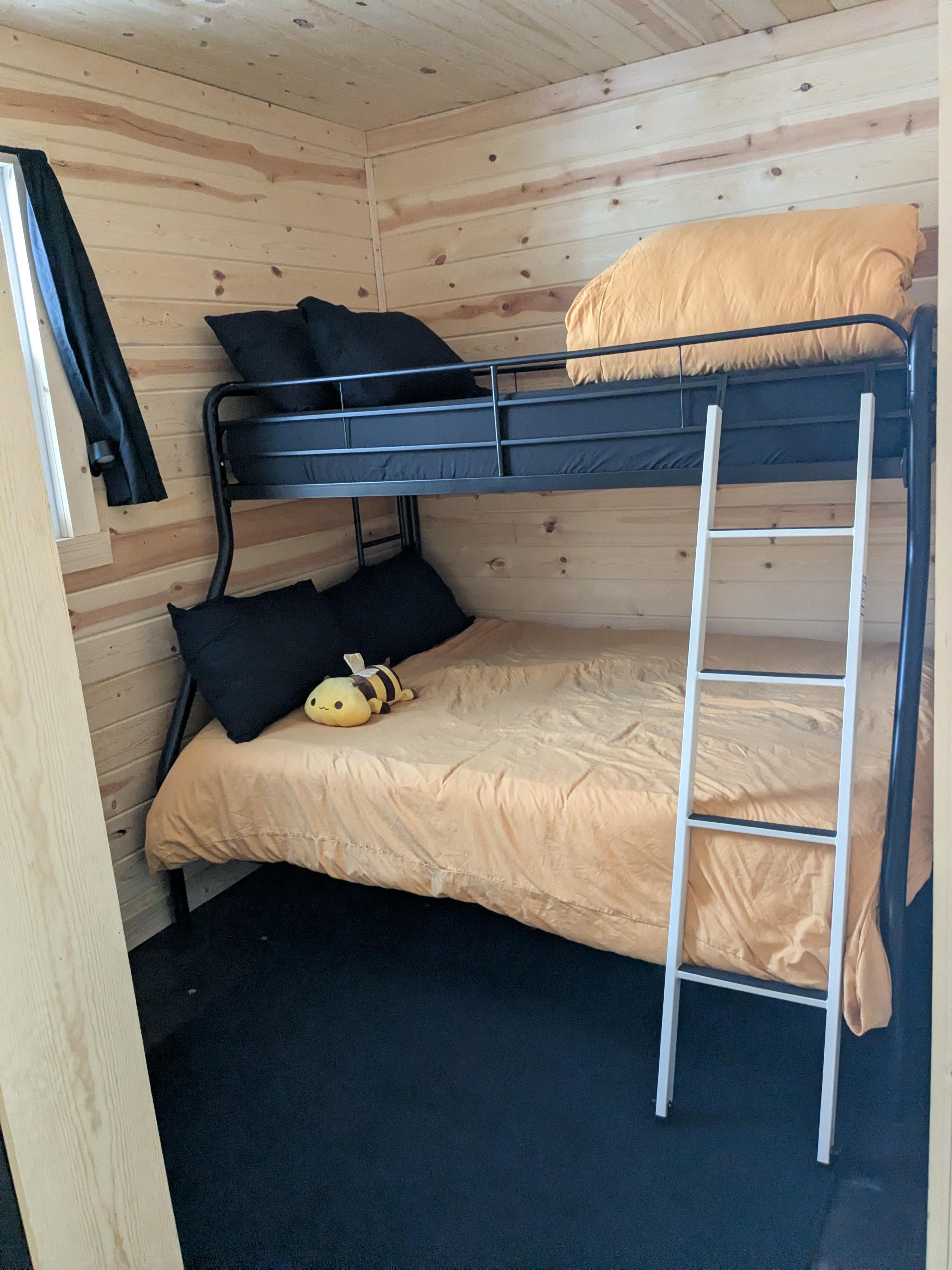 Our cabin offers two bedrooms—one with a queen-size bed and the other with a twin-over-full bunk bed—making it perfect for families or small groups.