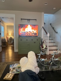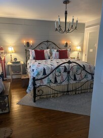 Cuando conduces hasta Heiser Haus, no puedes evitar sentirte recibido por su alegre exterior azul y su audaz puerta naranja. Una vez dentro, se sentirá como en casa con pisos de madera dura y muebles cómodos pero lujosos. Dos grandes sofás color crema están perfectamente ubicados para disfrutar de la televisión de pantalla plana o la chimenea eléctrica. Un acogedor conjunto de escaleras lo lleva a la Master Suite, donde encontrará una cama King forjada a mano local con ropa de cama bien equipada. El baño en suite tiene una bañera profunda y una ducha a ras de suelo y se juega con una lámpara de araña de cristal y apliques. El dormitorio y el baño de tamaño King de la planta baja son igualmente magníficos, por lo que no es necesario discutir qué pareja tiene qué suite.