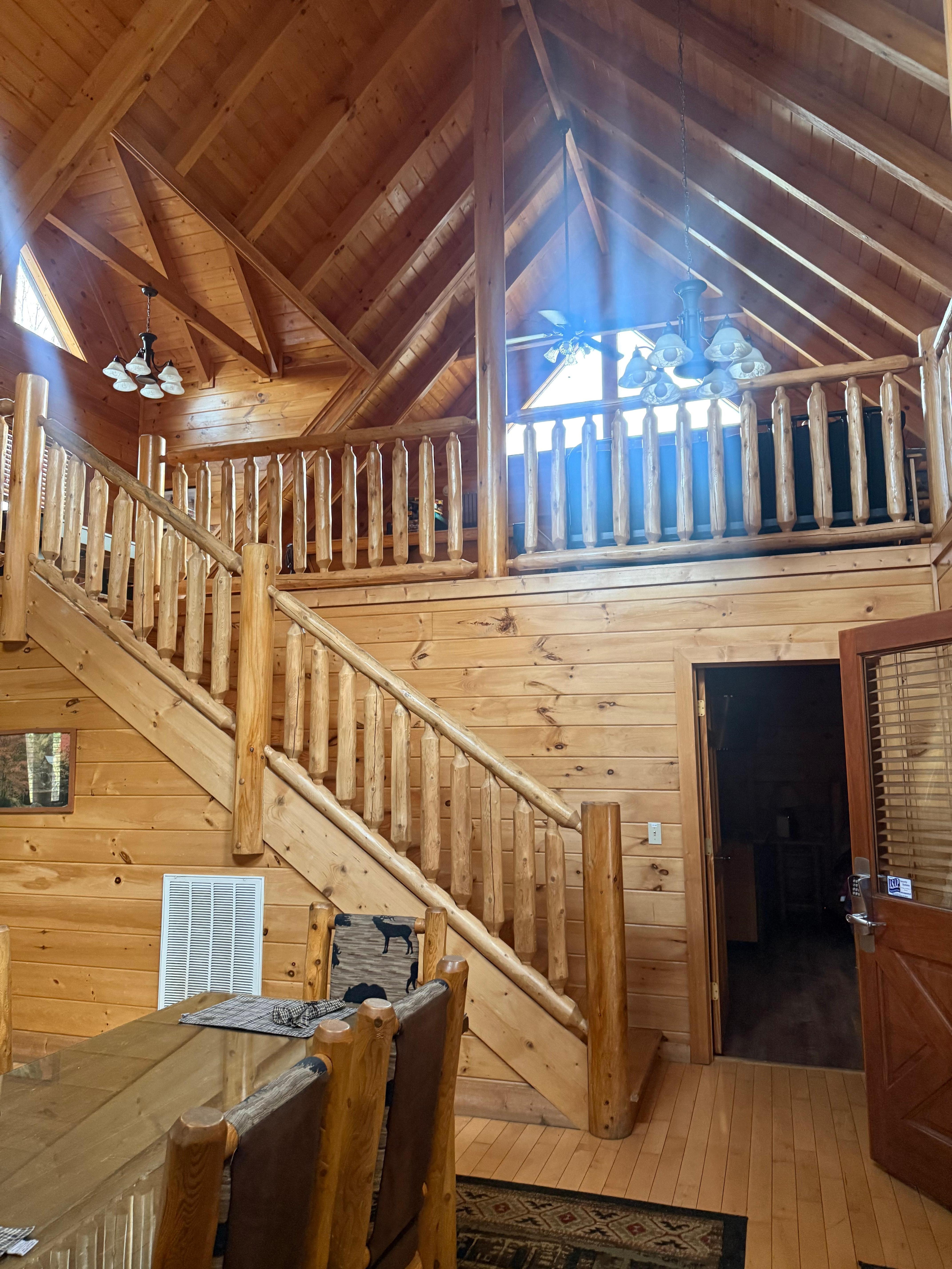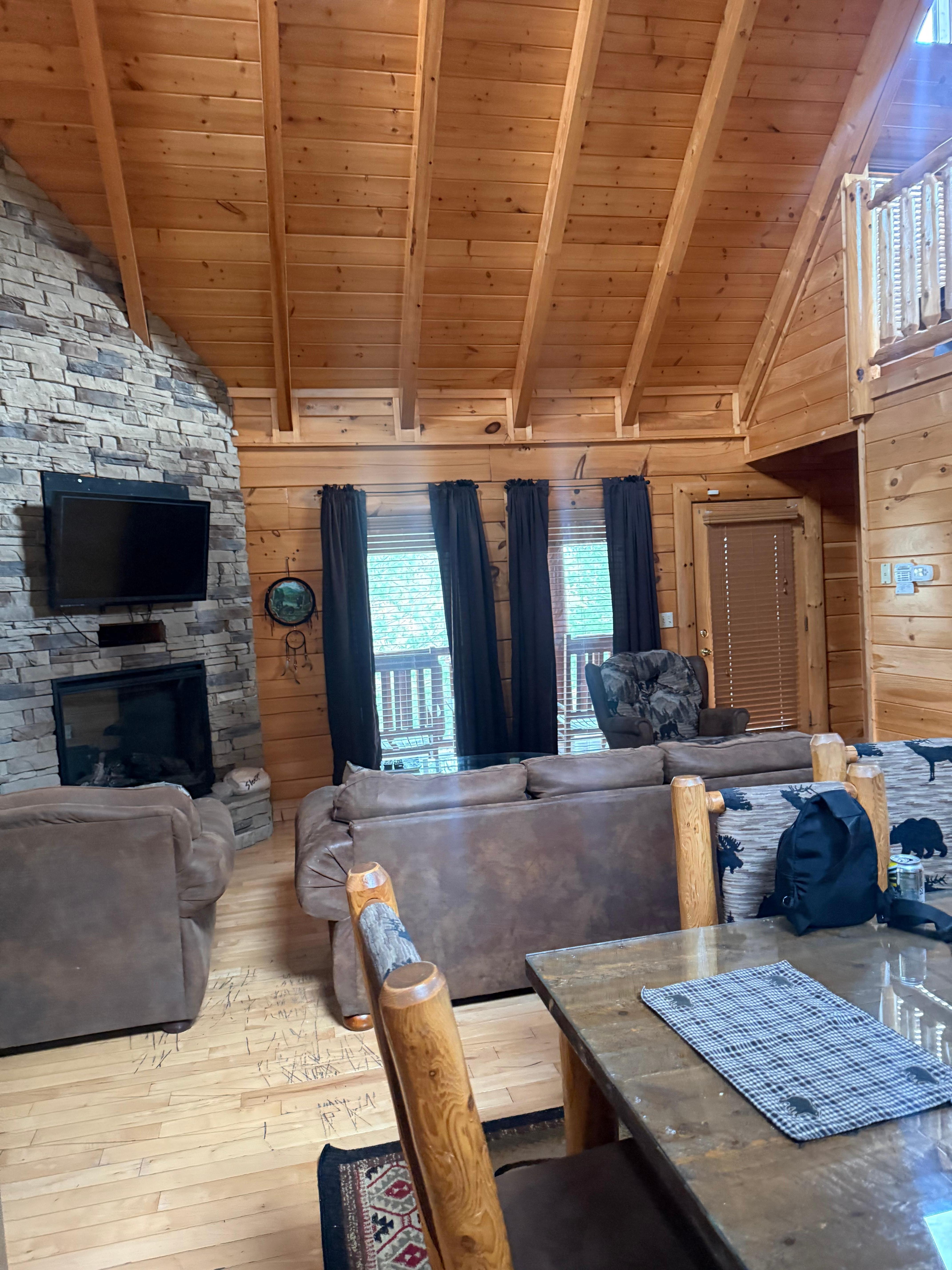 Le encantará el porche con rockeros país y la parte superior de la línea 6 personas jacuzzi con cascada y bañera con luz de fibra óptica y chorros. Va a estar en el temor a pie en la gran sala con techo abovedado, electrodomésticos nuevos de acero inoxidable, todos los nuevos platos, así como utensilios para hornear, ollas, pequeños electrodomésticos, etc. Usted tendrá todas las comodidades del hogar. Podrá disfrutar de comer en la hermosa mesa de comedor de registro personalizado con asientos acolchados de registro. Se sentirá como en casa en la zona de estar con chimenea piso a techo, muebles de soportar temática y TV de pantalla plana para ver la televisión directa con todos los canales premium. Hay un sofá-cama. Hay 2 suites King con todos los muebles nuevos y cada uno tiene su propio tema oso negro. Los niños les encantará el loft con una nueva cama litera de registro que ofrece una cama de matrimonio y dos camas. El loft también se completa con una nueva mesa de billar, hockey de aire nuevo, nuevo de pie sala de videojuegos, futón nuevo, y la nueva mesa de juego.