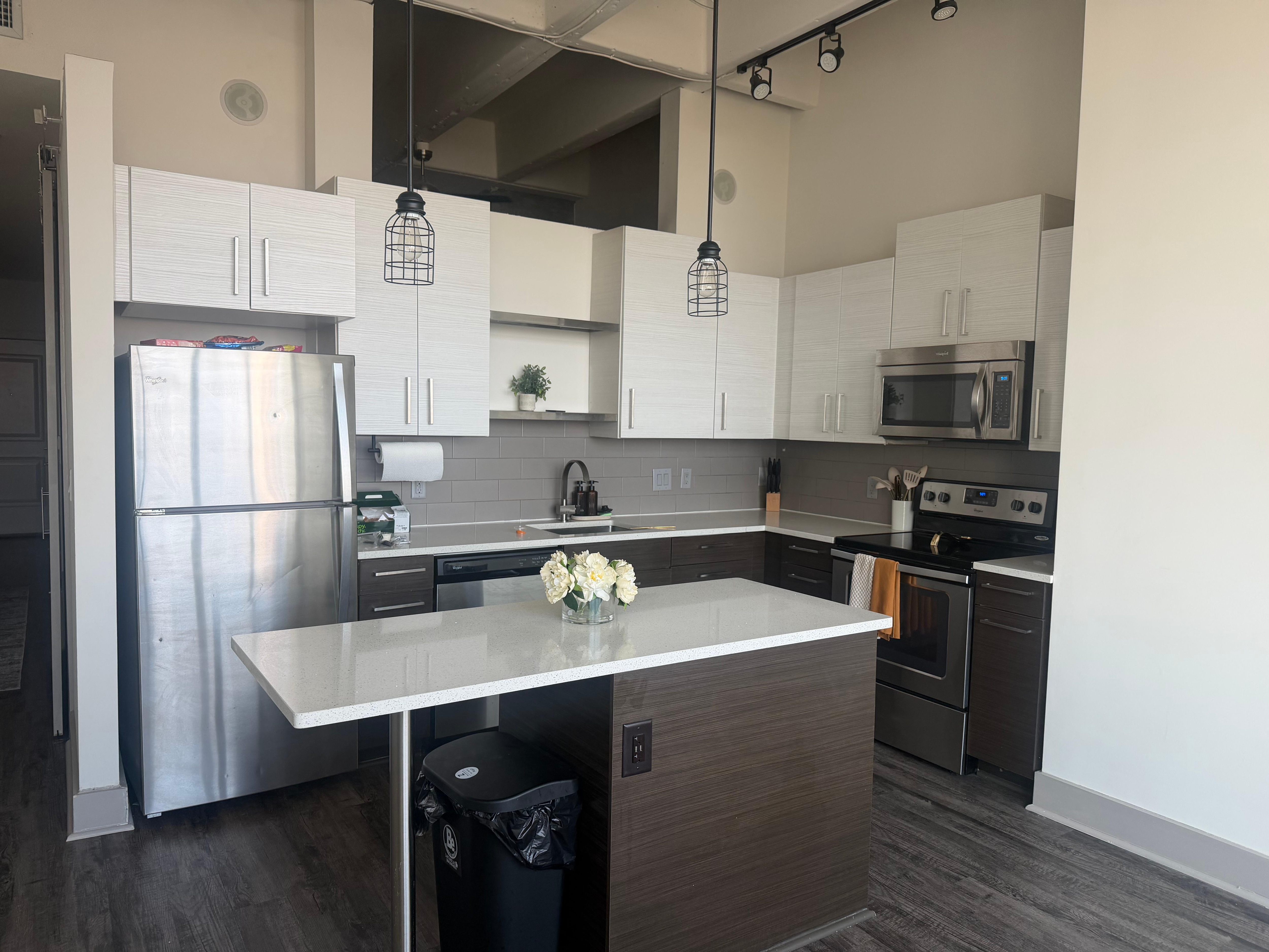 This apartment holds panoramic views of the city skyline, modern interior design with floor-to-ceiling windows, and integration of Atlanta culture and history.