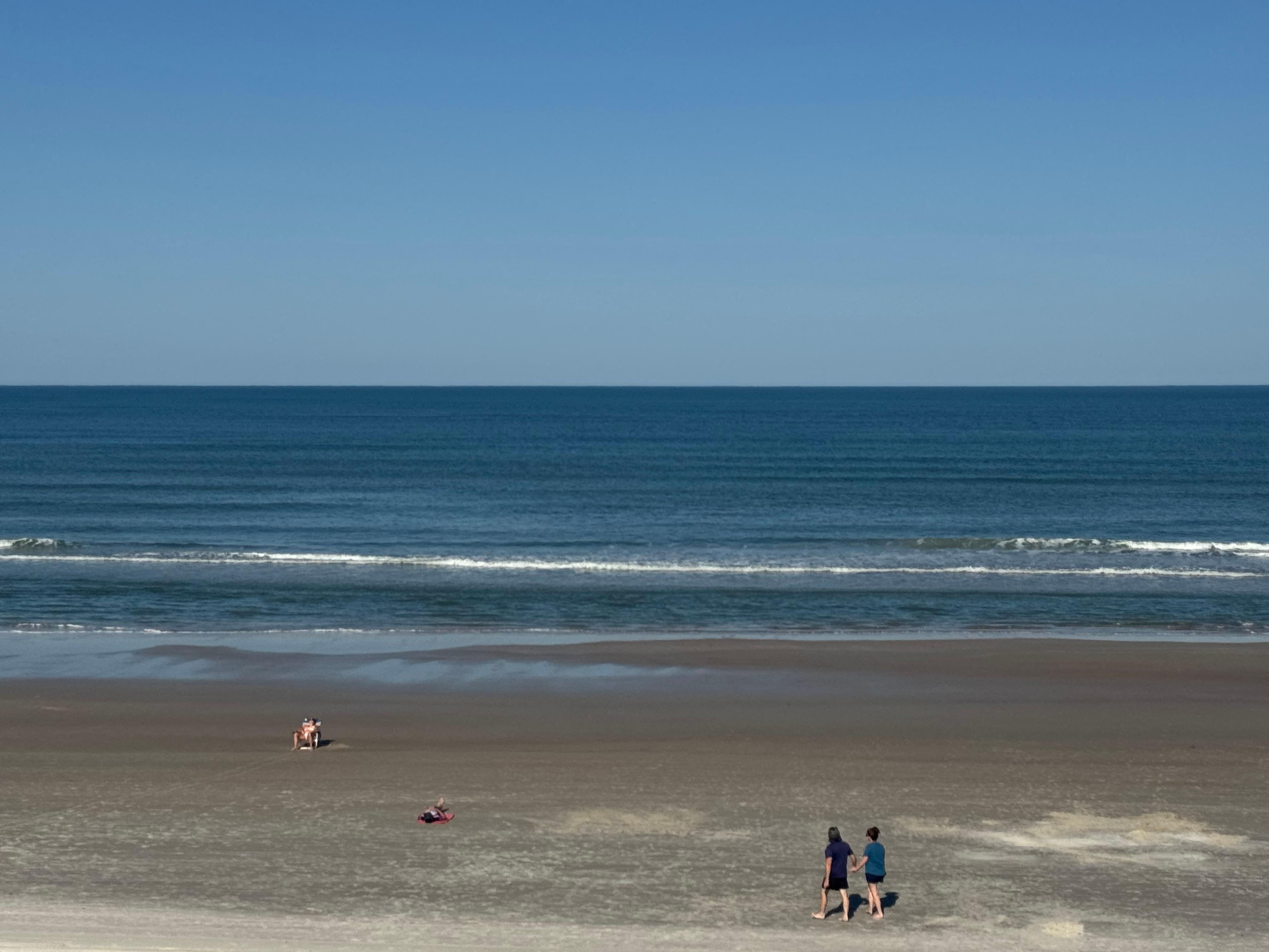 The facilities are very well maintained and it is very safe with electronic locks on every outside door (including the gate to the beach) and secure covered parking. It has the usual amenities of a brand new heated pool, an exercise room, sauna, and tennis, shuffleboard and basketball courts. But our favorite thing about the building is the location; it is located south of the Dunlawton bridge, the best location in Daytona Beach Shores. The Sunglow Pier is within easy walking distance (you can see it in the picture of the beach above) and has a restaurant right on the ocean, Crabby Joe’s. We’re about ¾ of a mile south of the Dunlawton bridge and about four miles north of the lighthouse at Ponce Inlet; it too can be seen from the condominium balcony. There is a Starbucks a couple blocks away.
