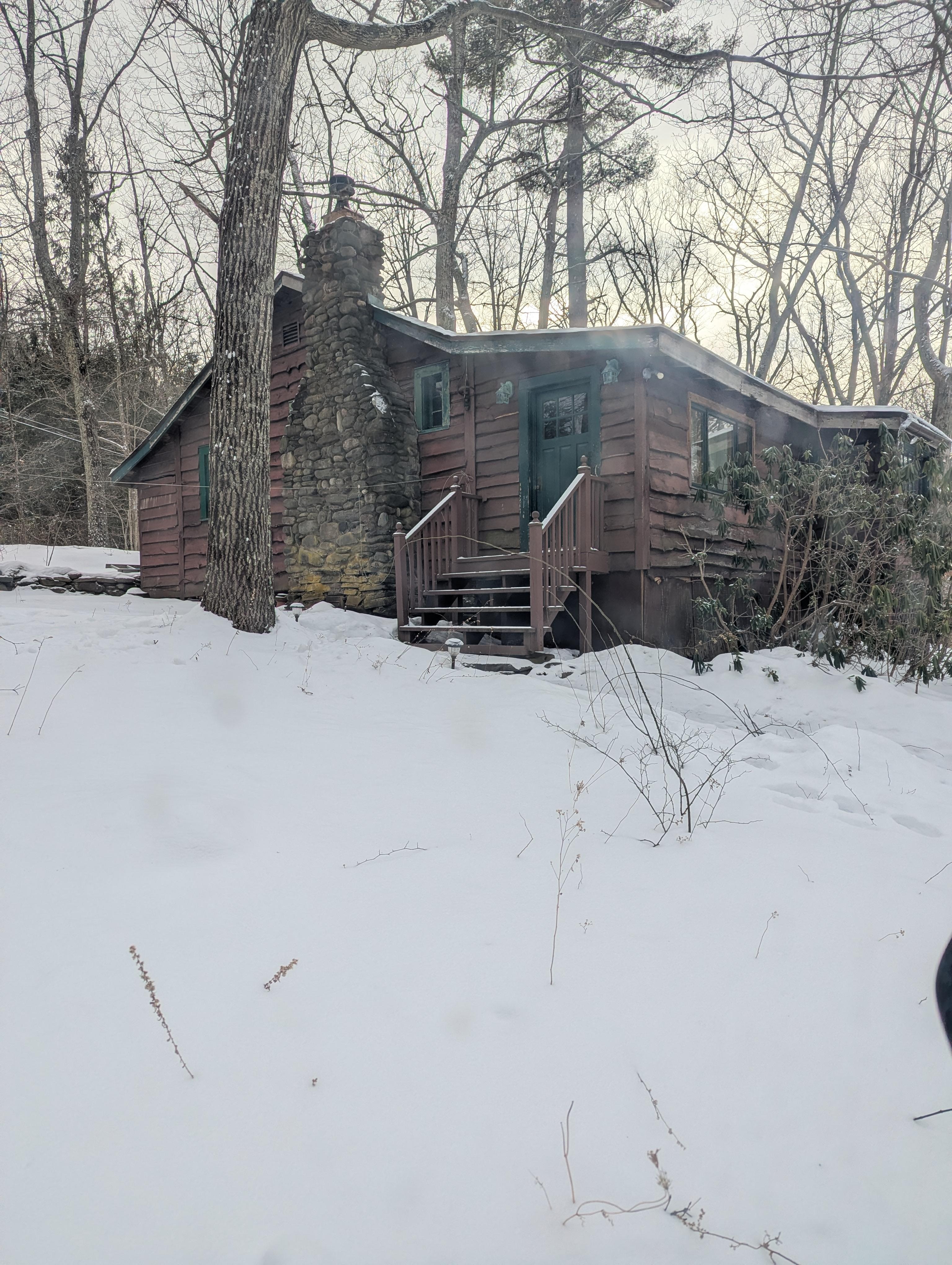 La encantadora cabaña en las hermosas montañas de catskill tiene una cama de tamaño completo y un sofá cama para invitados adicionales en la alcoba. Se puede alojar una cuarta persona, hable con nosotros primero si es un requisito. La cocina tiene refrigerador grande y cocina a gas, microondas y utensilios, ollas y sartenes y más para todas sus necesidades de cocina. Estufa de leña para esas noches frías. Pisos de madera dura. El patio trasero tiene un arroyo tranquilo y apta para nadar en el clima cálido. Mesa de picnic y parrilla de carbón para cocinar al aire libre.