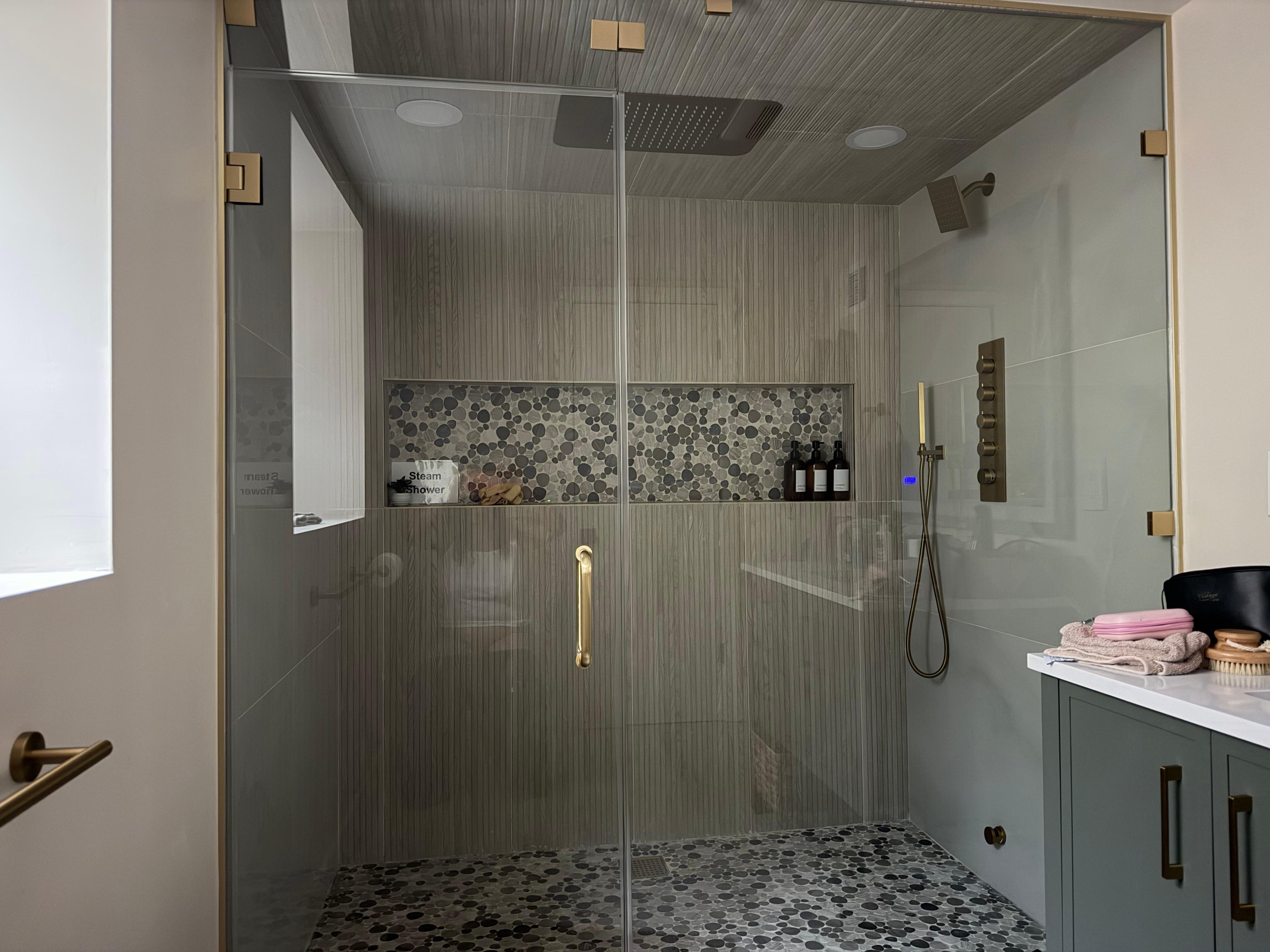 ● A main-level suite with a walk-in steam shower and heated floors