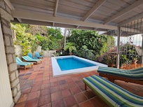 Las comodidades incluyen la piscina privada de 18'X10 'rodeada de plantas tropicales y una terraza para tomar el sol. También se proporcionan sillas de piscina y tumbonas planas.
