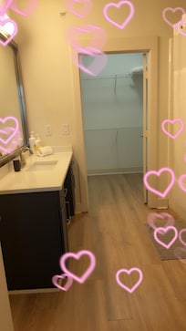 • Bathroom 2 (shared): Shower/tub combo, fresh towels, toiletries, and a vanity with mirror.