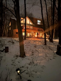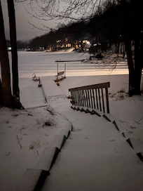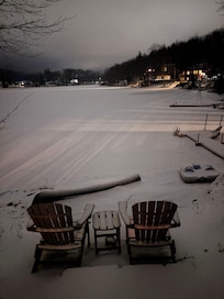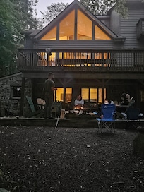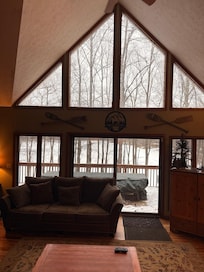 Casa de 2 pisos con sótano terminado sentado en el agua en la comunidad de Big Bass Lake a solo 5 minutos de la I-380. La casa tiene una cocina moderna, abierta, lavadora y secadora, chimenea a gas y 2 áreas de TV (sala familiar, sótano terminado).