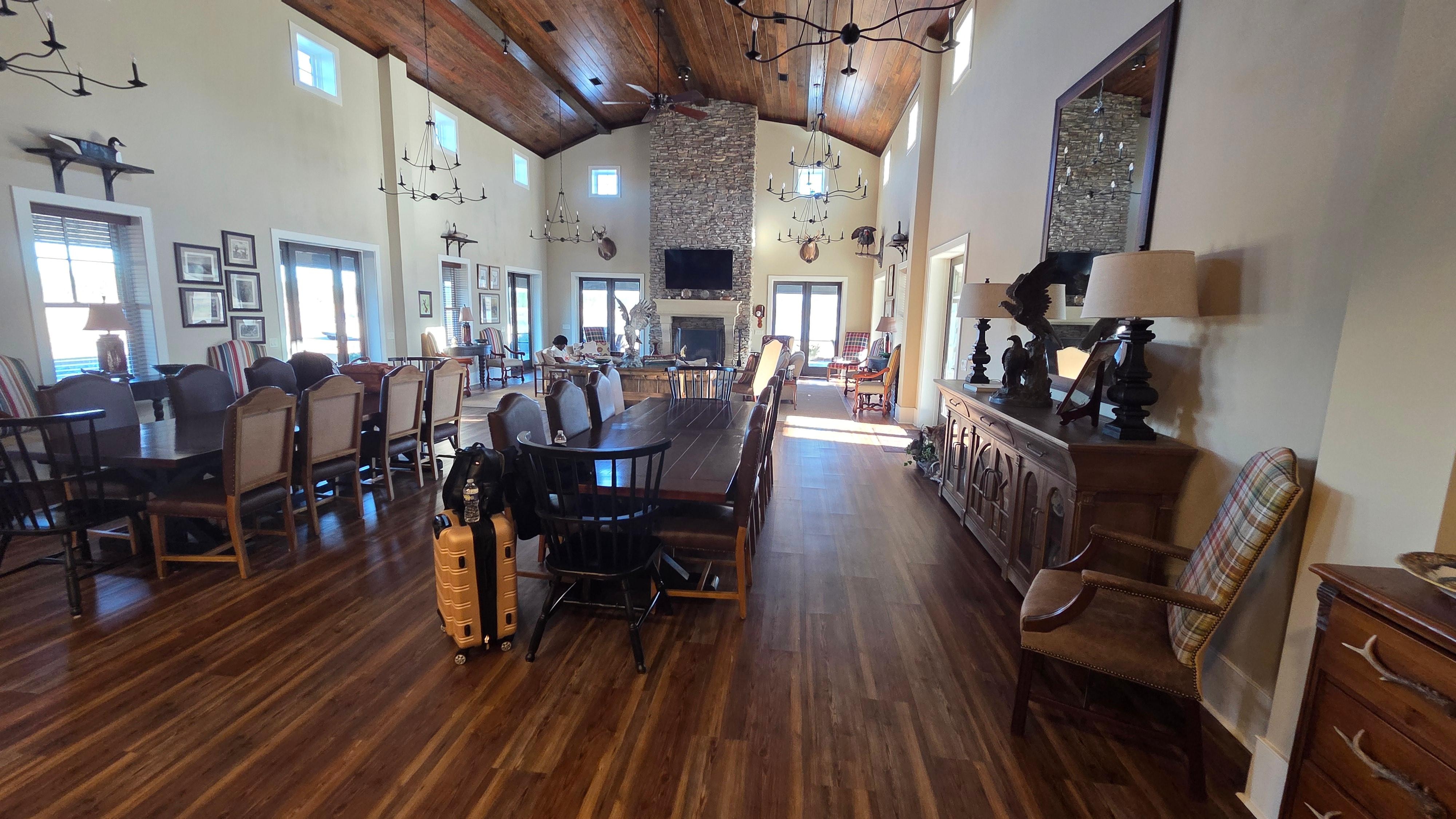 Wake up a beautiful sunrise located right in South Georgia. JP is a large and spacious lodge that will sleep up to 24 guests and has plenty of outdoor acreage to explore, offering your group or family a fun and enjoyable space. Guests will enjoy private bedrooms/bathrooms and living areas with loads of square footage to give privacy and space. Indulge in the comfort and tranquility of this country lodge. The space features an open-concept layout, a woodsy color scheme with stark contrasts, wood surfaces, and tasteful furnishings and decor. You will love the views from our large lake and the peacefulness of the country. Pick from one of our 6 bedrooms, drop your bags, and explore the space. Upstairs, you will find a pool table, a large gaming table, a TV, and a bar area. Downstairs, you will find a large chef's kitchen with everything needed to cook a gourmet dinner. We have 2 large dining tables that sit 10 each, plus another table that can be accessed to sit another 6. The large double-sided gas /wood fireplace is great for those cool nights in the large family room or outside on the screened-in porch.