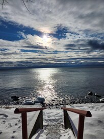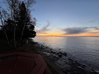This vintage 1940's log-sided cabin is a delightful retreat year-round that feels secluded but is convenient to shopping, hiking, and skiing. The cabin sleeps 6 in 3 BRs (2 queen, 1 with twin bunks). A massive deck overlooking Lake Superior with adirondack chairs, an outdoor dining table, and a gas grill, extend the living space during warmer months. In winter, the big stone fireplace and picture windows looking over the lake make for a cozy place to snuggle up with a book, play games, or just relax after a long day of skiing at nearby Lutsen Mountain or the Sugarbush XC trail network.
