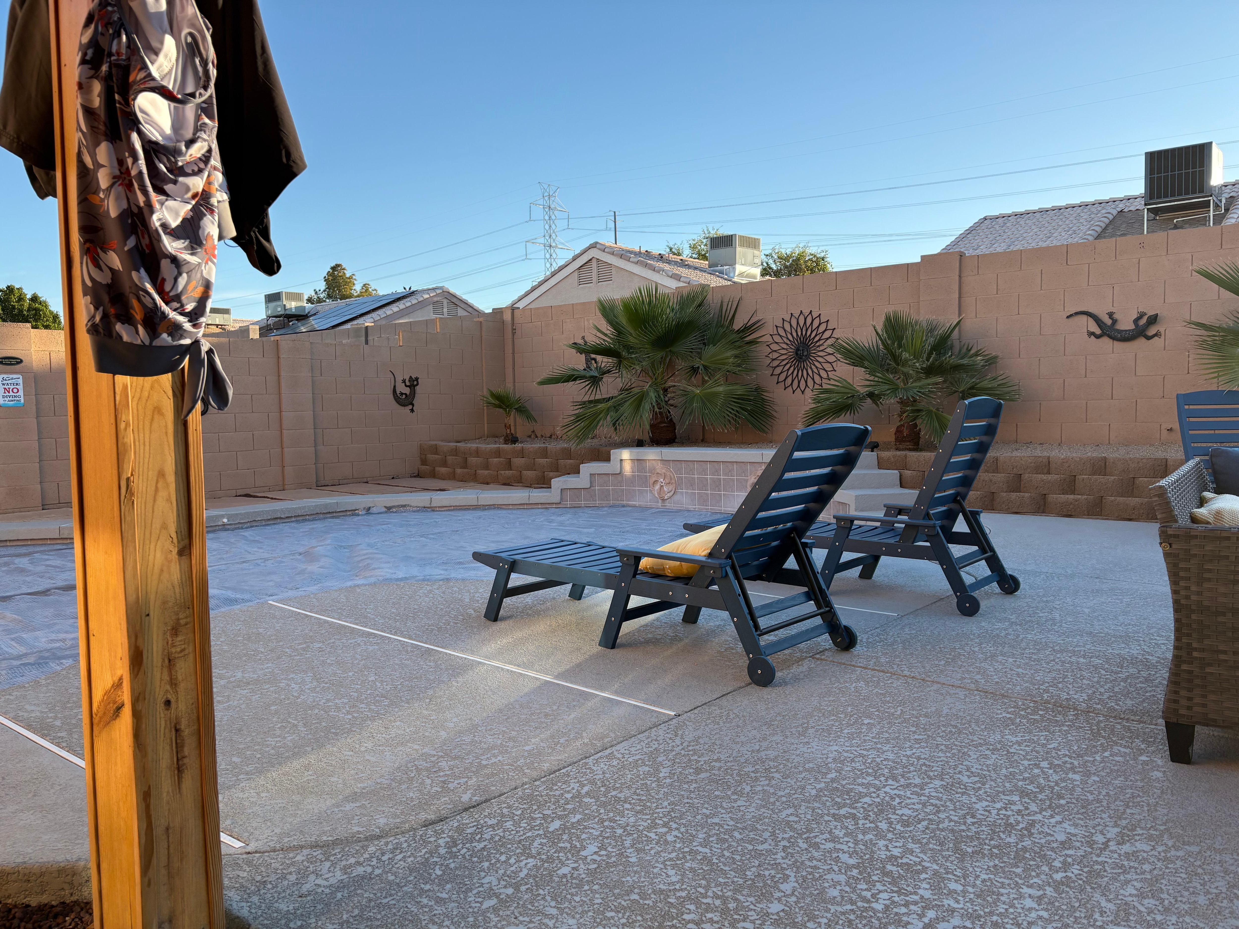 The outdoor space of this home is where the magic is!! It has a large heated pool with cool decking, great covered patio area with a dining table that seats 8, and extra seating around the propane firepit. To make your stay more comfortable, we have provided pool floaties, noodles and toys to enjoy while swimming in your private pool in the Arizona sunshine. For added security, an alarm is positioned on the slider door to let people know when it has been opened. Our home has been recently updated with new, white tile throughout, renovated bathrooms and kitchen and all new furniture and furnishings. A designated coffee bar with complimentary coffee, tea, creamers and sweetners are also located in the home. There is extra linens, towels, bedding and other essentials for our guests to use and enjoy. There is also two extra queen air mattresses for our guests to use.