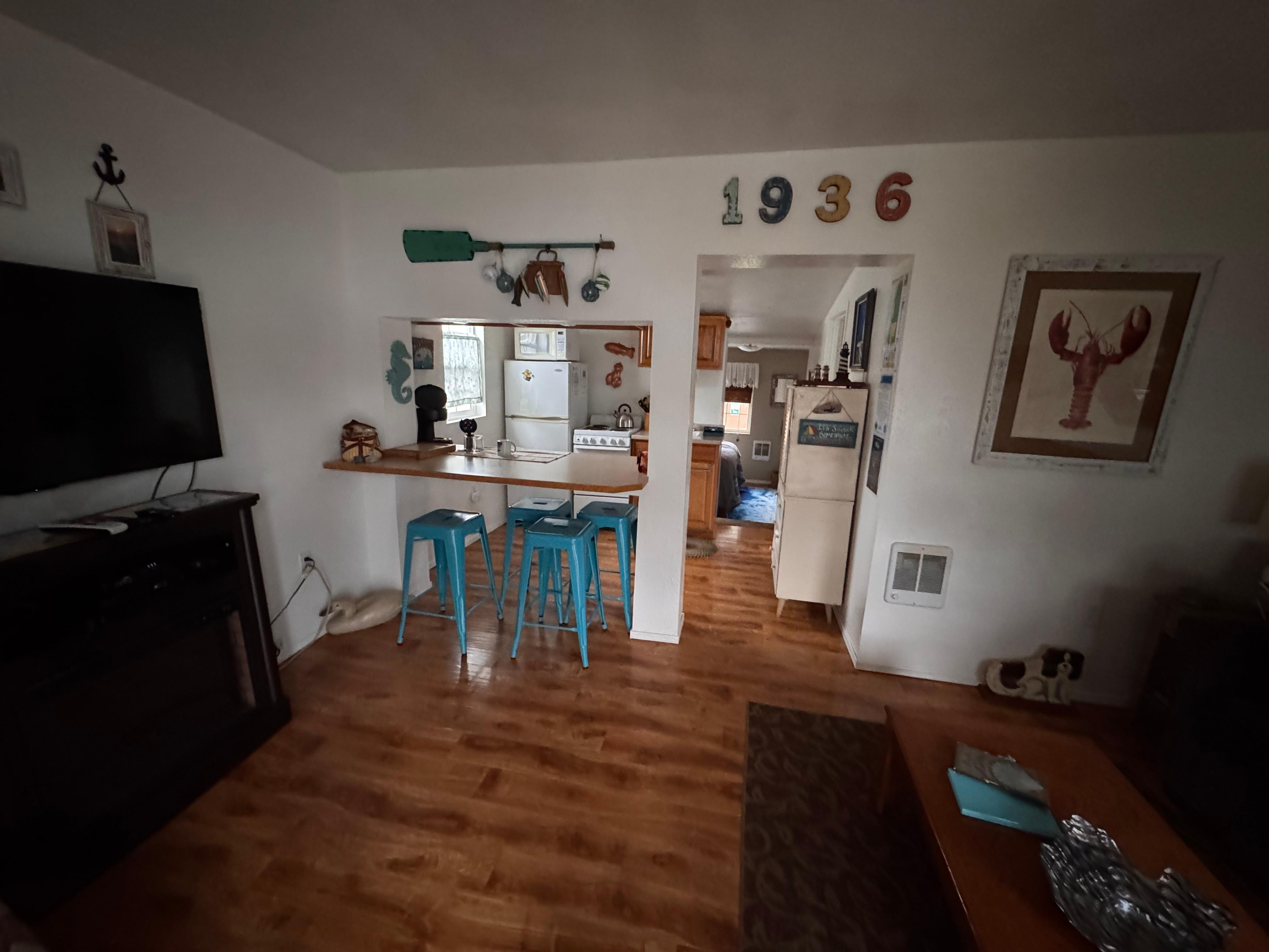 Step inside to a cozy living area that blends original charm with relaxed, nautical touches. Kick back on the sleeper sofa after a day on the sand, warm up by the electric fireplace, and flip on cable TV or a favorite movie on the DVD player. With WiFi and board games on hand, you can mix movie nights, game tournaments, and a little scrolling or email catch-up as needed.
