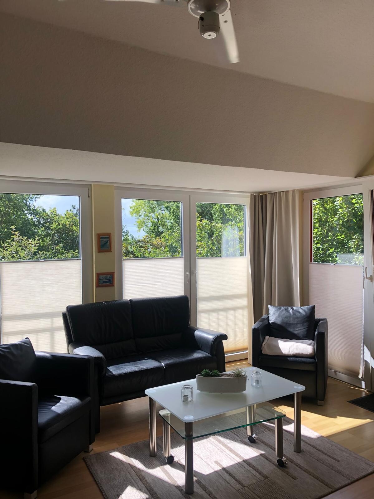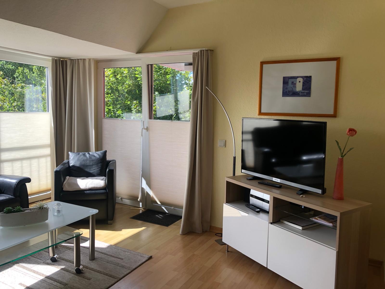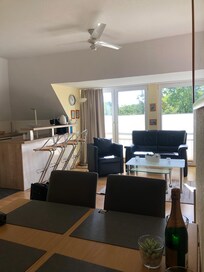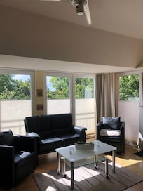 La soleada sala de estar inundada de luz con TV por cable, radio y. El reproductor de CD consta de una zona de estar y un comedor. Hay camas para 4 personas: 1 habitación con dos camas individuales y una cama plegable de alta calidad en la sala de estar.