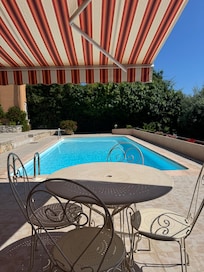 Beautiful 50 m² apartment, on the ground floor, close to the centre of Vence, for 2 people, with a garage for your car, a lovely 9 x 4 m private swimming pool, a private beach with deckchairs and garden furniture. Another covered terrace with an outdoor dining table. Bedroom with double bed (160x200), living room with TV, Wi-Fi (wireless internet connection), well-equipped kitchen with oven, microwave, Nespresso coffee machine, toaster... Old town, supermarket and shops within a few minutes' walk (so some noise possible during the day). It is ideally located for visiting the entire Côte d'Azur. 15 minutes by car to the beach, 10 minutes to the new luxury shopping centre Polygone Riviera. Towels, bath towels and bed linen are included and provided weekly. Washing machine in the bathroom (shower), separate toilet.