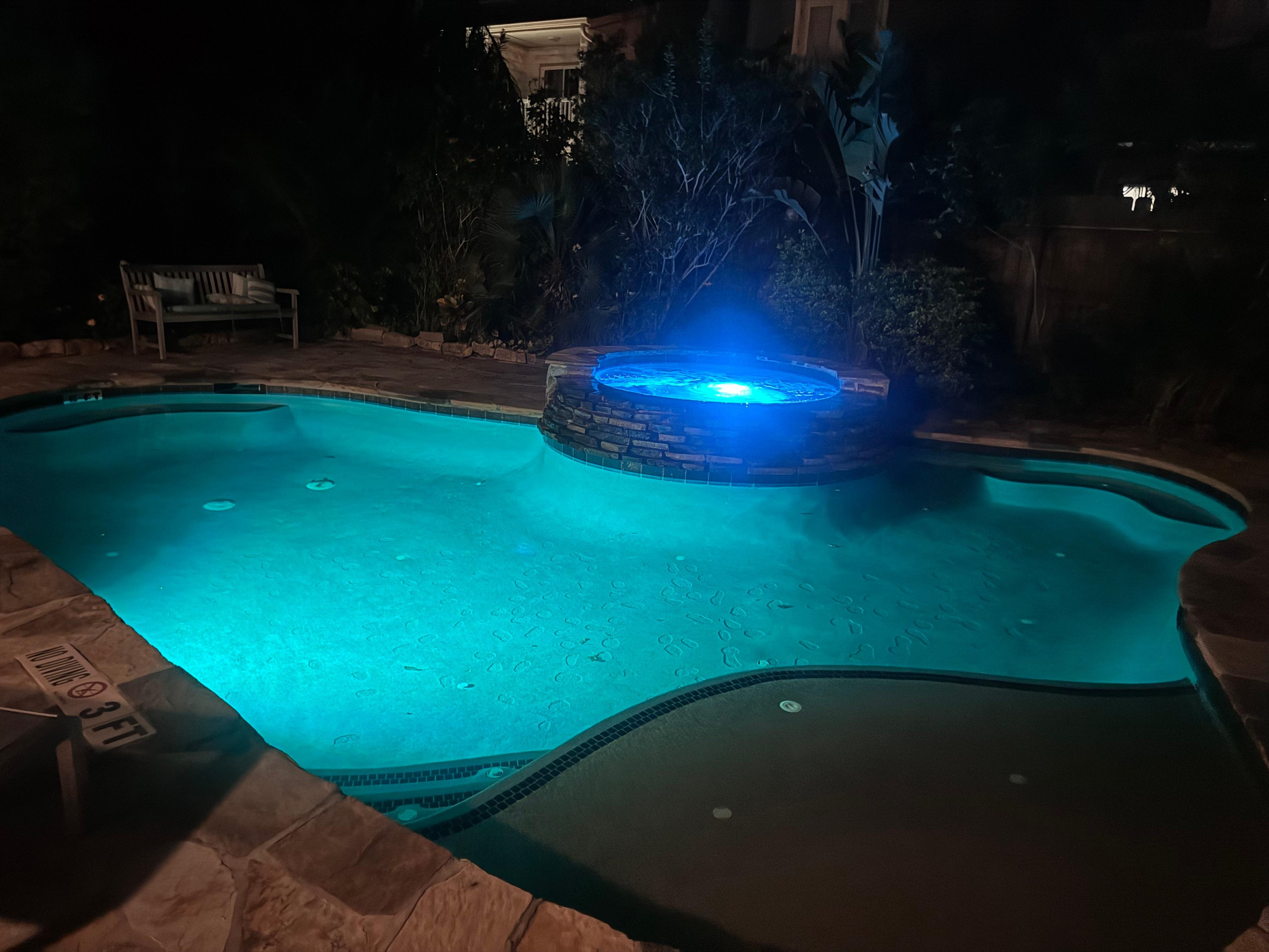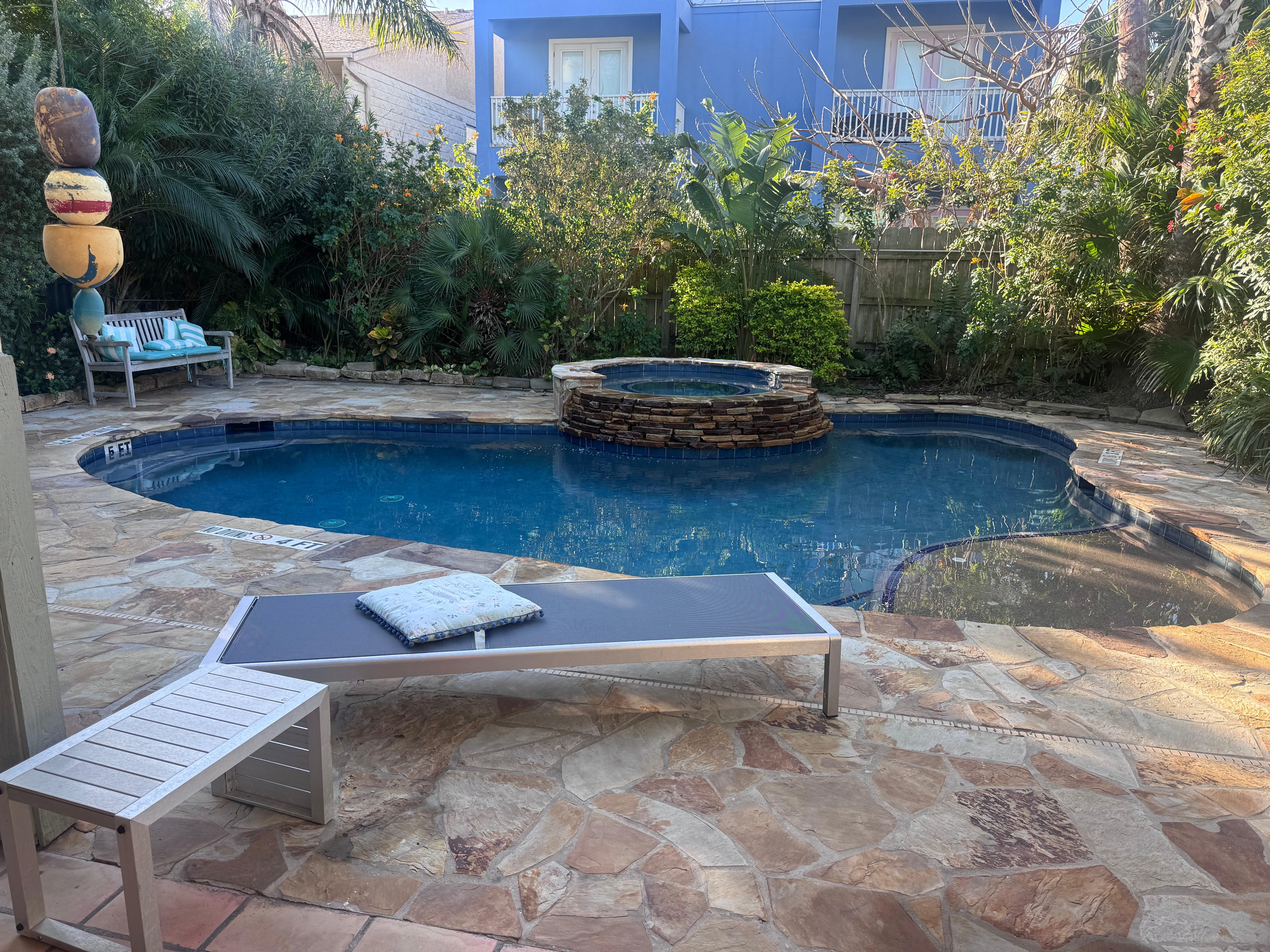 Diviértase en el amplio y privado patio trasero, piscina de diseño personalizado con terraza y jacuzzi en cascada. El patio está lujosamente ajardinado con plantas tropicales y terrazas de losas, y cuenta con una barra envolvente cubierta con fregadero, ideal para comidas familiares o cócteles por la noche.
