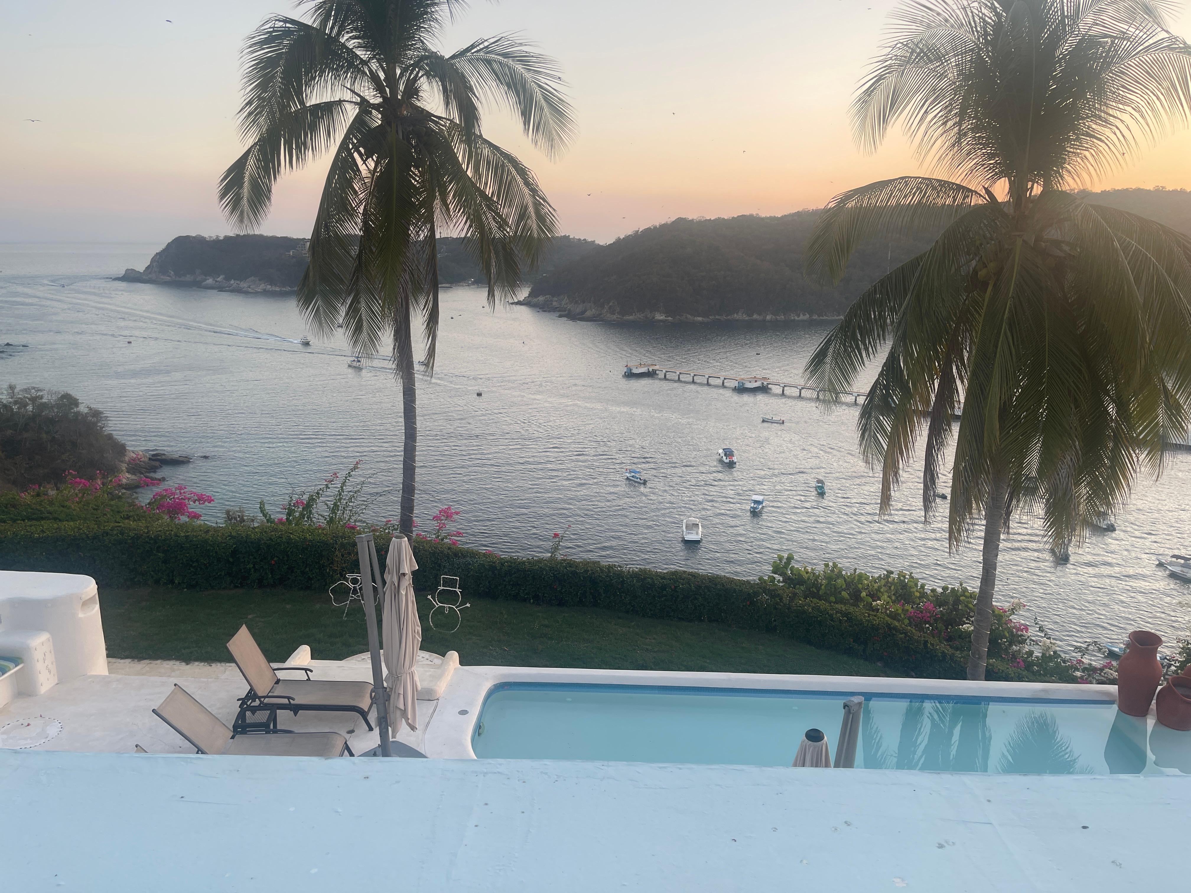 Sol y Luna cuenta con una gran sala de estar con techos altos, pisos de mármol, encimeras de granito, decoración elegante y una de las vistas más hermosas de Huatulco. Uno de los pocos lugares en Huatulco donde puedes ver el amanecer y la puesta de sol desde tu balcón y terraza. Disfrute de su café matutino (cultivado localmente) mientras observa a Santa Cruz despertarse. Si tiene suerte, un crucero atracará frente a usted. La tarde te trae espectaculares puestas de sol sobre las montañas. En el medio, puede explorar las hermosas playas o, si lo prefiere, descansar en la hermosa piscina infinita.