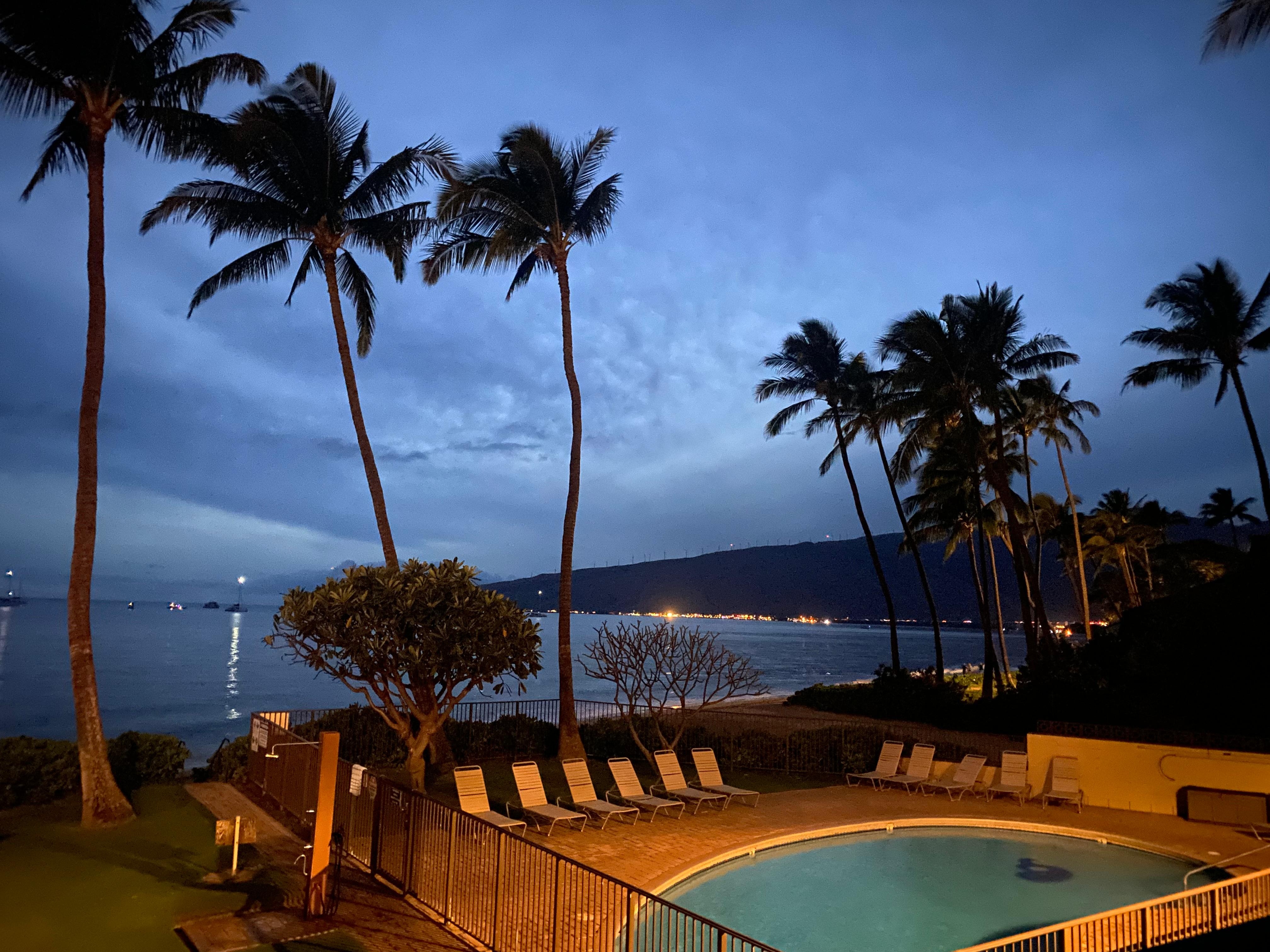 Durante la temporada alta (diciembre-abril), las ballenas jorobadas (mamás, bebés y hombres guardianes) encuentran refugio en la Bahía de Maalaea; La vista de ellos rompiendo es siempre emocionante. Durante todo el a��o podrá disfrutar de espectaculares amaneceres y puestas de sol durante el día, y los cielos repletos de estrellas y los rayos de luna plateados brillarán en el Pacífico de noche.