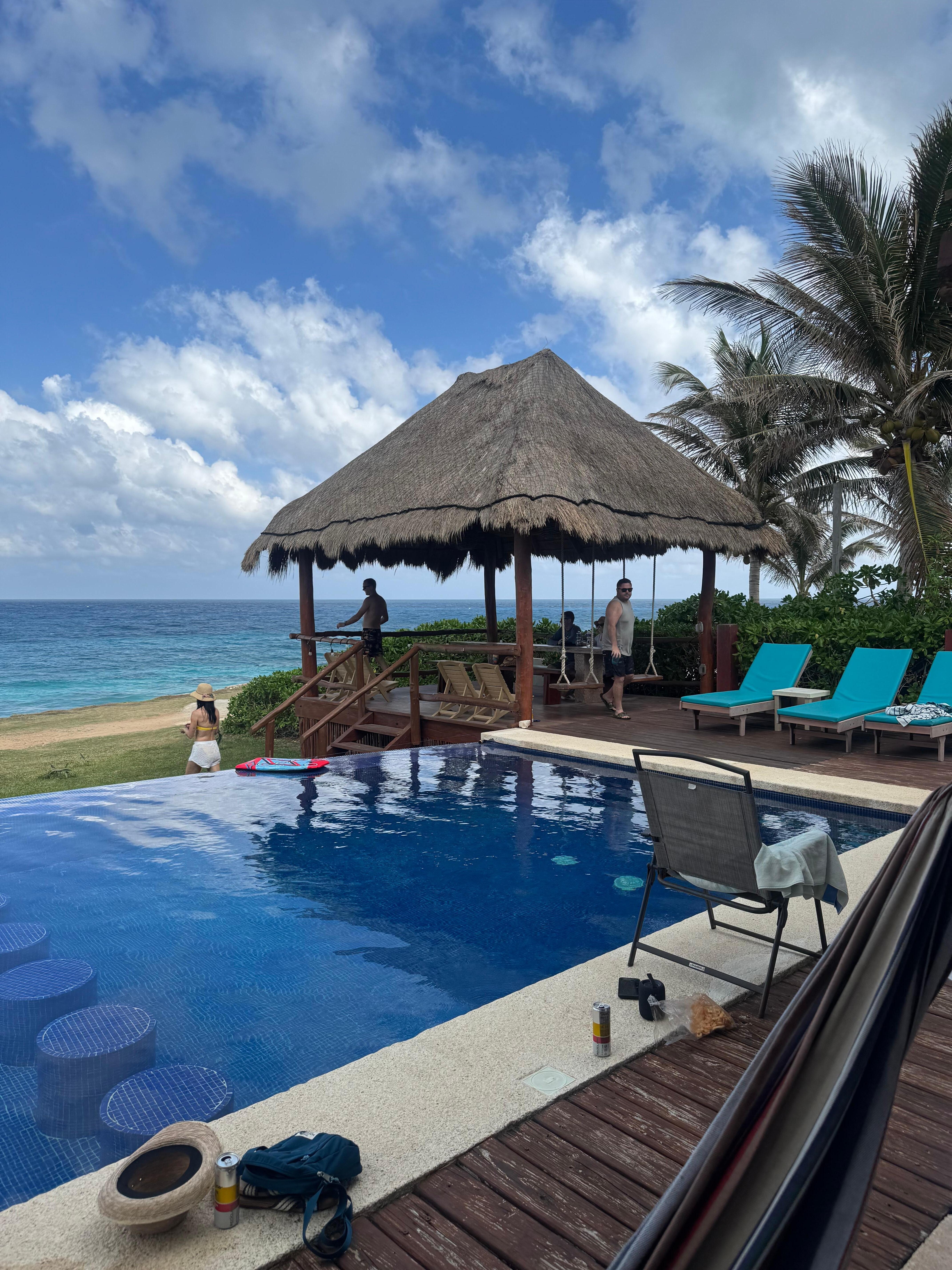 Villa Esperanza es una hermosa propiedad de 2 pisos frente al mar. Con una vista espectacular, la casa se encuentra en el tranquilo punto sur de la isla. Mientras nada en la piscina infinita, descansa o lee un buen libro en las hamacas o en la terraza para completar su tranquila experiencia en la playa. La increíble vista de las aguas turquesas nunca dejará de decepcionar. Hay cuatro cómodas tumbonas acolchadas en la terraza y una sombrilla y muchas cómodas sillas y sofás para que disfrutes. Incluso puede ver dofines nadando o tortugas dependiendo de la época del año y siempre habrá iguanas tomando el sol cerca. Villa Esperanaza combina la arquitectura moderna con muebles rústicos y tradicionales mexicanos, artesanías folclóricas y hermosas obras de arte. Todos los días verás el impresionante amanecer de Isla Mujeres y, a veces, también la luna. La casa está bellamente ajardinada con la flora y la fauna de México, rodeada de palmeras con cocos. Villa Esperanza es perfecta para familias, parejas de aventuras grupales. La piscina tiene un lado poco profundo para niños. Los huéspedes tienen acceso a todo en la casa, incluidas toallas de playa, colchonetas de yoga y equipo de playa. La casa dispone de parking y WIFI. Los invitados son recibidos por Monica Quintos, nuestro gerente, o un miembro de su equipo. Hay una cocina totalmente equipada, TV y además de las tres habitaciones, la sala de lectura / mudanza tiene un futón. Cada habitación tiene excelentes vistas del mar Caribe. Los comestibles pueden estar esperándolo a su llegada. Obtiene servicio de limpieza por solicitud. Hay muchos lugares para ver en el lado sur de la isla, incluidas las famosas ruinas de Ixchel y jardines de esculturas y bares y restaurantes cercanos. El parque acuático Garrafón está a solo unos minutos. Se recomienda que alquile un carrito de golf, lo que podemos ayudarlo a hacer antes de su llegada. O puede alquilar bicicletas en la ciudad para explorar todas las partes de esta hermosa isla. Si disfruta de un buen mojito, el restaurante Joint está a pocos pasos de distancia. Si eres un corredor o un caminante, disfrutarás del sendero a lo largo de la costa hacia el área principal de la ciudad o hacia La Gloria, la comunidad cercana con bares, restaurantes, música y comestibles. Es una casa maravillosa para relajarse, entretenerse y disfrutar de todos los placeres de Isla Mujeres.