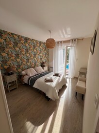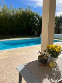 (Texto traducido automáticamente) Casa nueva con 6.00x3.25 climatizada (de abril a octubre), piscina, tranquilo vallada, 500 m2 de terreno, con olivos, palmeras, etc ... lujo, cómoda cocina bien equipada, decorada con buen gusto, todas las habitaciones con TV y DVD, sala de TV y naranja wifi a internet, 4 bicicletas disponibles, 6 hamacas, tenis de mesa.
