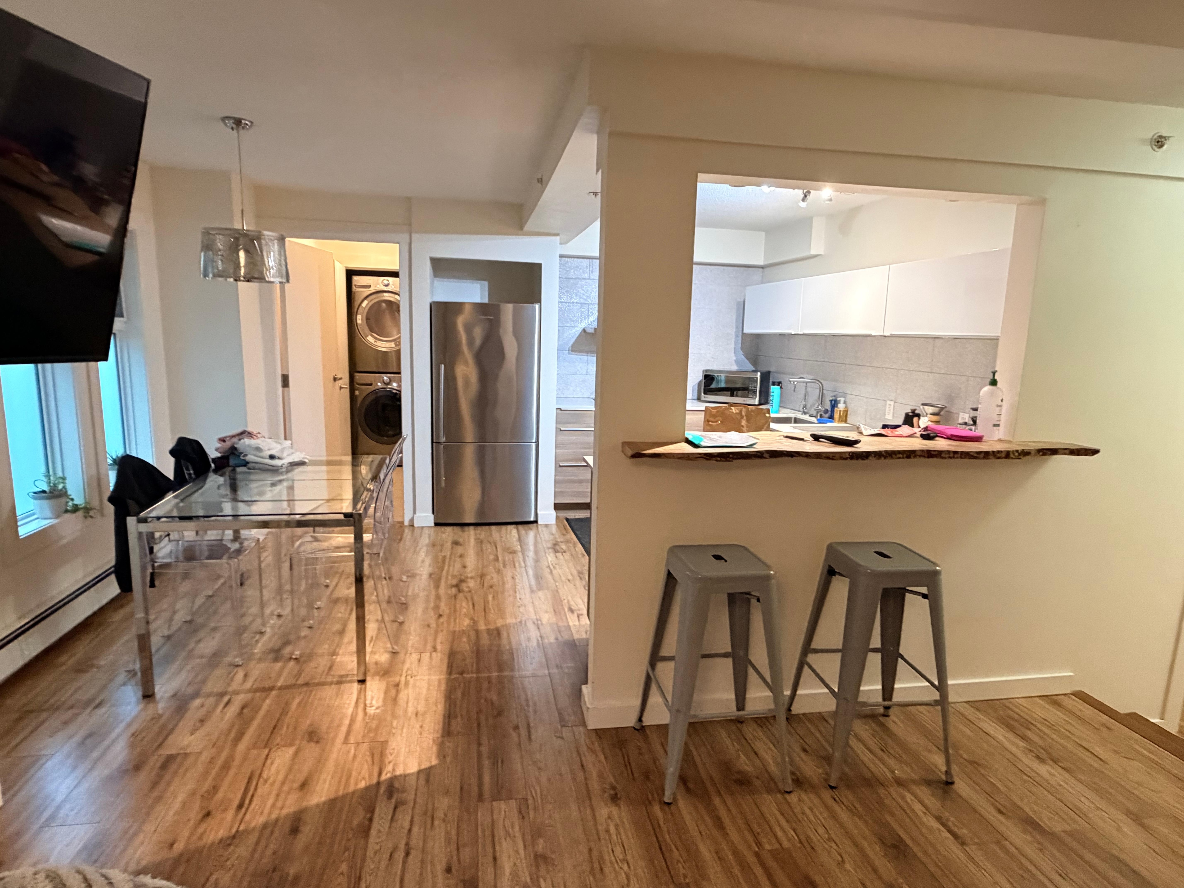 Prepare el desayuno en la comodidad de su cocina europea bien equipada. Más tarde, organice un almuerzo o cena para amigos o colegas de negocios. La mesa del comedor se extiende para acomodar hasta 8 personas en la sala de estar de concepto abierto.