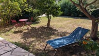 Amplia terraza de 60 m2 (incluyendo 40 m2 cubiertos) equipadas con mesa, sillas, baño de sol, barbacoa. Gran jardín y césped.
