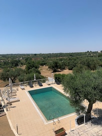 Vista panorámica de la terraza y la piscina en completa privacidad con la serenidad de la campiña de Apulia y la proximidad del mar.