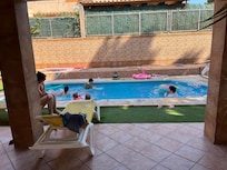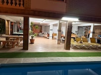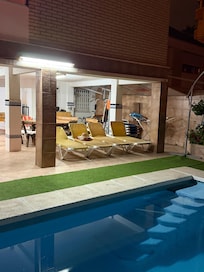 En el jardin privado , barbacoa multiusos ( con todo el equipamiento) tenemos, mesa terraza de madera con capacidad para 10 personas, mesa piedra con capacidad para 6 personas, zona de juegos equipada con cama elástica para niños, 7 bicicletas, billar americano y futbolín, gimnasio, piscina cubierta ( mayor limpieza),10 tumbonas, plantas, fuente de agua, flores, arboles