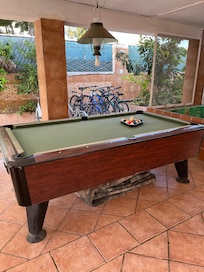 In the private garden, multipurpose barbecue (with all equipment) have, terrace wooden table that seats 9 people, stone table with seating for 6 persons, playground equipped with a trampoline, bikes, American and foosball, billiards, pool cover (which is maintained at a temperature and cleanliness), deck chairs, plants, water fountain, flowers, trees