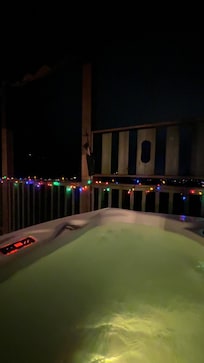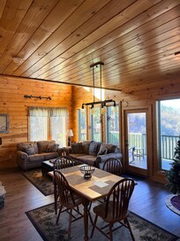 La cabina está cargada con todas las comodidades para su disfrute y entretenimiento. Relájese en la sala de estar en el nuevo sofá o el sofá de dos plazas junto a la chimenea de piedra apilada mientras mira su DVD favorito en la pantalla plana de 55 pulgadas. ¿Tienes una cuenta de Netflix? Ambos televisores son capaces de transmitir Netflix y otras aplicaciones, solo inicie sesión. La sala de estar del nivel principal tiene acceso al porche trasero que está equipado con dos balancines para sacudir sus preocupaciones, así como una bañera de hidromasaje para 5 personas con vista a la montaña y hermosas puestas de sol. El piso principal también cuenta con una cocina de tamaño completo con electrodomésticos de acero inoxidable, un agradable comedor y lavadora / secadora. La Master Suite con cama Queen, pantalla plana de 40 "con cable y baño completo. También se puede acceder a un segundo baño completo con ducha en la zona del desván.