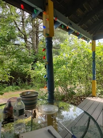 Casa de invitados de 1 dormitorio de 1930 con una sala de estar completa que también cuenta con un nuevo sofá cama tamaño completo. Cocina completa con mesa de comedor y sillas de época, así como un pase a través con 2 sillas giratorias de respaldo alto en el lado de la sala de estar. Estufa de gas de tamaño completo y un gran mostrador y fregadero de azulejos del metro. Escritorio de metal de 1940 en un rincón con ventanas de la sala de estar. Grandes ventanales tanto en la sala como en la cocina que dan a los 8 acres de bosques. Baño completo fuera del dormitorio con una gran combinación de bañera y ducha con patas y lavamanos vintage y un inodoro nuevo. Wifi disponible y te es un televisor de pantalla plana y reproductor de DVD. Pequeño porche exterior con mesa y sillas. Ventiladores de techo en el dormitorio y sala de estar, además de calefacción en el invierno.