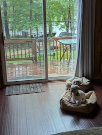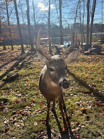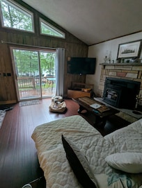 Sofá grande y cómodo frente a la estufa de pellets con vista al lago y un televisor de pantalla plana de 55 "con Hulu y varios otros canales de Roku. Diseño abierto con la cocina y el comedor, la mesa del comedor es extensible y puede acomodar fácilmente a un grupo grande. La cocina tiene todos los elementos esenciales que pueda necesitar. Baño recientemente renovado con lavadora y secadora.