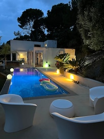 Gran villa diseñada por un arquitecto de 200 m2 a 10 minutos a pie del corazón del pueblo (panadería, supermercado, prensa, mercado de los domingos, ..), 3 dormitorios + estudio independiente con aire acondicionado en terrenos muy arbolados (pinos y robles) de 2500 m2, muy moderno y amenidades de lujo, piso refrescante, aire acondicionado en el piso superior, internet, wifi + netflix gratis, 5 televisores, espacios grandes y ventanales en 8 m en una vista plana sin frente y Mont Ventoux, ideal para 2 familias (4 adultos, 4 niños), 1 suite principal con cama de matrimonio, vestidor independiente y baño grande, 1 estudio independiente junto a la piscina con cama de 140 cm y baño, 2 habitaciones con 2 camas de 90 cm y baño compartido, habitación Sala de estar de 60 m2, cocina abierta y moderna con equipo de thermomix, 3 baños, sala de juegos para niños con sofá cama doble, plancha y parrilla al aire libre, casita de piscina con cocina de verano y instalación de audio BOSE Bluetooth, gran terraza sombreada con salón d 'fl 60m2 y jacuzzi (opcional), playa alrededor de la piscina de 80m2 con cama 2 lugares, piscina 12mx3m estacionamiento seguro cerrado en la propiedad.