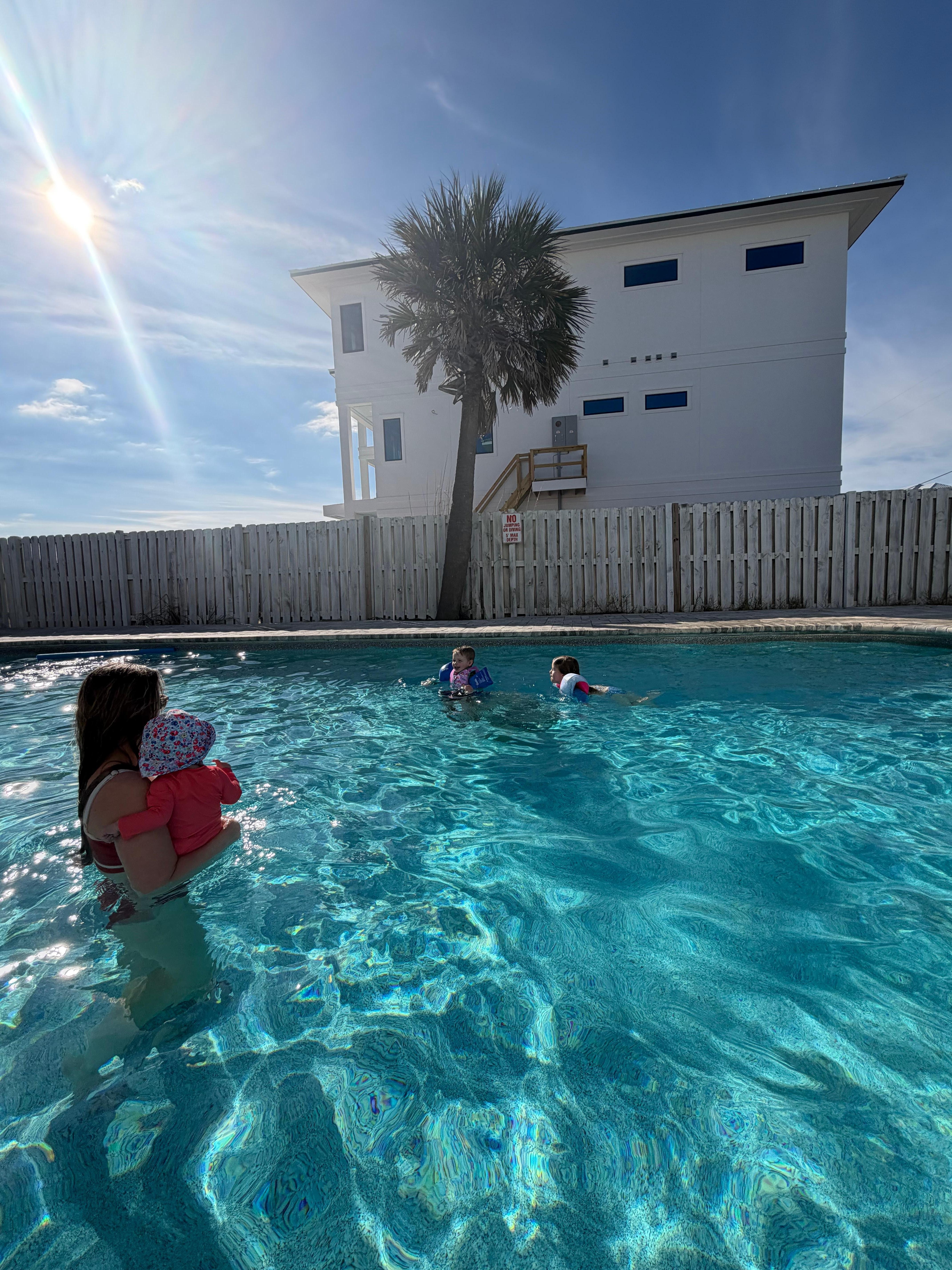 We had an amazing time, even though the weather let us down. Amazing ocean/beach views from almost everywhere. Large island and gathering table in the great room on the main floor. Elevator worked consistently well and was easy to use for grandpa.Interestingly, most of the televisions are very small and not very modern. The common area on the top floor has the only modern TV. In the main bedroom on the top floor, the TV was too far away to read closed captioning while watching from the bed.Dryer on the main floor did not really get anything dry; it needs fixing or replacing.Outside outlets on the main floor balcony did not work, and a service person came by but didn't really know how to fix them.Pool was nice once we had the heat turned on, but $100 per day is pretty steep. A comprehensive list of kitchen items and beach items would be very helpful. The website was incomplete, and Paradise Homes was initially not helpful when my wife called with some detailed questions. I called back and was able to talk to someone more helpful. For this price point we expected more beach chairs and umbrellas, and for the office to be super helpful at all times; for the most part they were. Rental chairs were $50 a pair per day. Purchasing chairs was not feasible since we had no way of getting them home. Other places in the area offer one or two sets of comped beach chair rentals.There were two coffee makers, but a Keurig would be more efficient and less wasteful.The shower pressure was a little light but we were still able to shower without issue. We appreciated the ice maker in the kitchen! A water purifier would be a nice addition in the little sink next to the ice maker.A couple of higher, comfortable chairs with arm rests would have been nice for those in the group that were elderly to sit more comfortably. Another couch in the common room on the topProperty was very clean upon arrival.We would love to to return