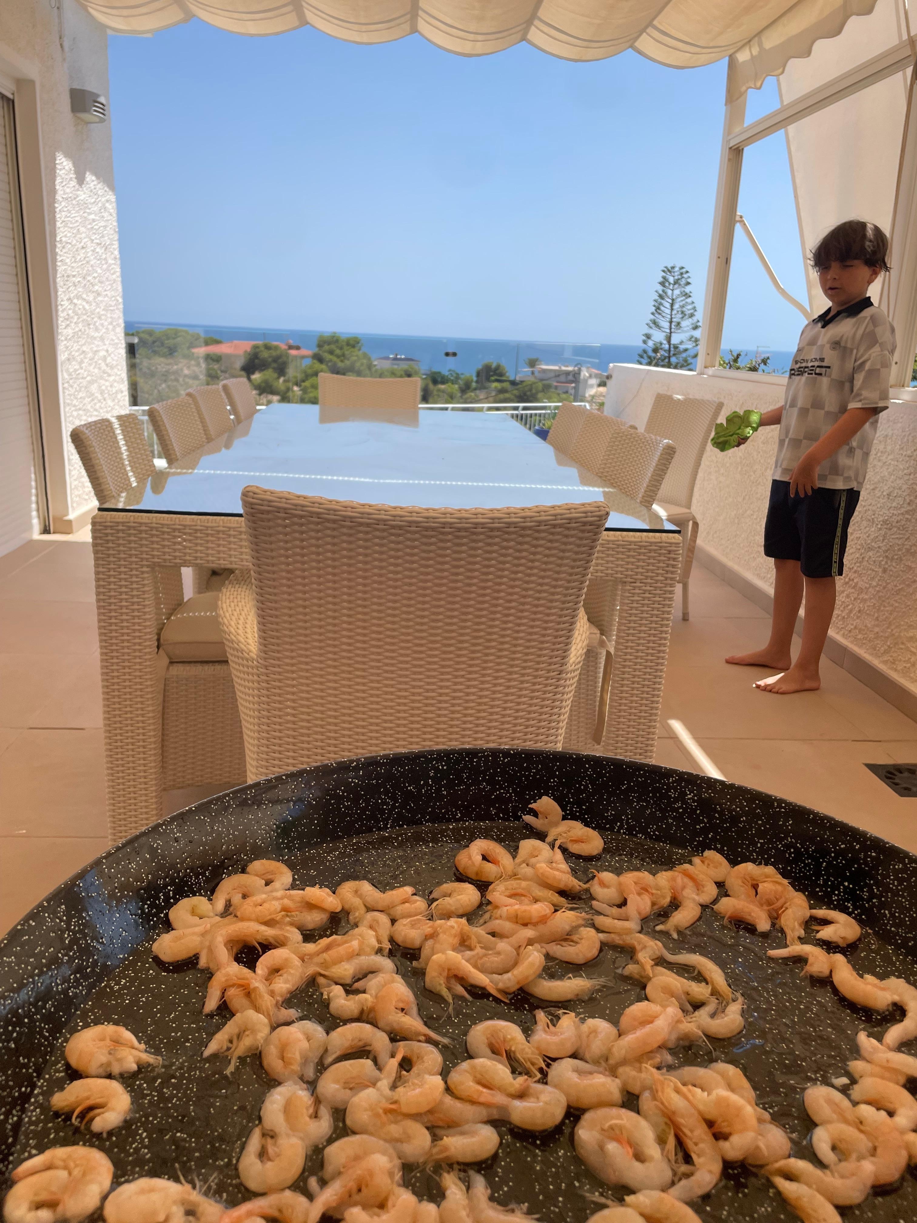 Parrilla de barbacoa y paella de cocina están disponibles en la cocina al aire libre.