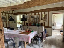 - 1 gran salón / comedor (55 m2) con un encanto irresistible: vigas de roble natural, majestuosa chimenea para grandes brotes, pisos de roble macizo, sótano de arenisca, doble exposición. Sala de estar alrededor de la chimenea: 1 sofá grande y cómodo, 4 sillones, 1 mesa de café. Side comedor: mesa grande para 8/10 personas. Acceso directo a la cocina. Ventana de francés en la terraza y el jardín.