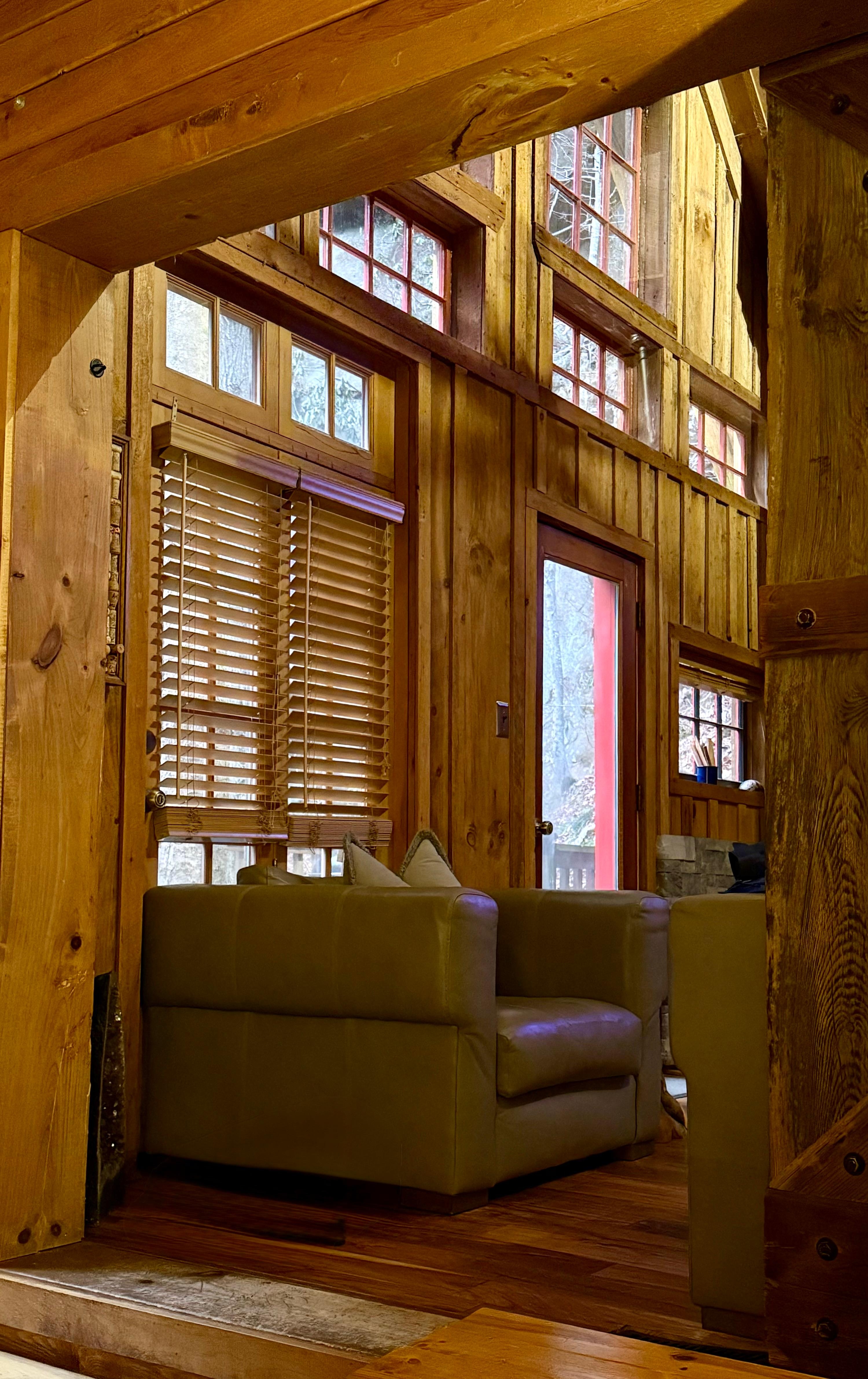 La cabaña tiene 3 camas Un dormitorio principal privado con una cama California King con una gran puerta de granero hecha a mano. Hay un altillo que contiene dos camas Queen divididas por una pared. Hay un sofá de buen tamaño para dormir y edredones extra, mantas y almohadas. Se han instalado nuevos electrodomésticos de cocina y el baño ha sido completamente remodelado. Las paredes del baño están hechas de madera de granero de 100 años.