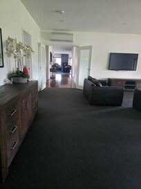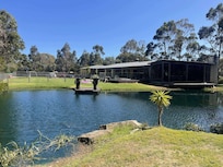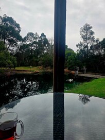 La casa tiene una sala de estar de planta abierta con una moderna cocina gourmet, chimenea de gas empotrada en la pared, un gran comedor y una gran sala de estar. El salón tiene salón de cuero, plasma, foxtel y dvd. Esta habitación lleva el exterior hacia adentro y se abre a la piscina climatizada / piscina climatizada a un lado y a una enorme área al aire libre cerrada con bar, chimenea única, Plasma, Foxtel y barbacoa. El vidrio del piso al techo justo sobre la presa trae el exterior hacia adentro y te hace sentir como si estuvieras completamente afuera pero protegido por el clima extremo sin importar lo que te arroje. Siéntese y observe a los patos o peces alimentarse en la superficie. Alternativamente, puede salir y pescar desde la cubierta o el muelle. La presa está completamente equipada con trucha, bacalao, bacalao de Murray y perca plateada.