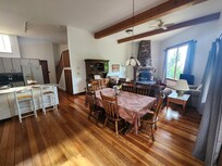 We wanted to build a home where we could feel peaceful, relaxed and at one with nature. Sitting by the big fireplace in the spacious 12 ft beamed ceiling living room watching and hearing nature through the large windows accomplishes that and more.