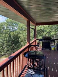 OUTDOOR LIVING: Wraparound deck w/ outdoor seating, patio w/ gas grill (propane not provided), lower deck, wood-burning fire pit (firewood not provided), private yard