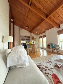 This is an open concept space and has all of the amenities that you will need to cook a memorable meal for your loved ones. Here is where you will find options for your morning cup of coffee (Nespresso/French Press) or tea and enjoy the panoramic ocean views. The kitchen opens into the dining and living room area which boasts vaulted ceilings with wood beams.