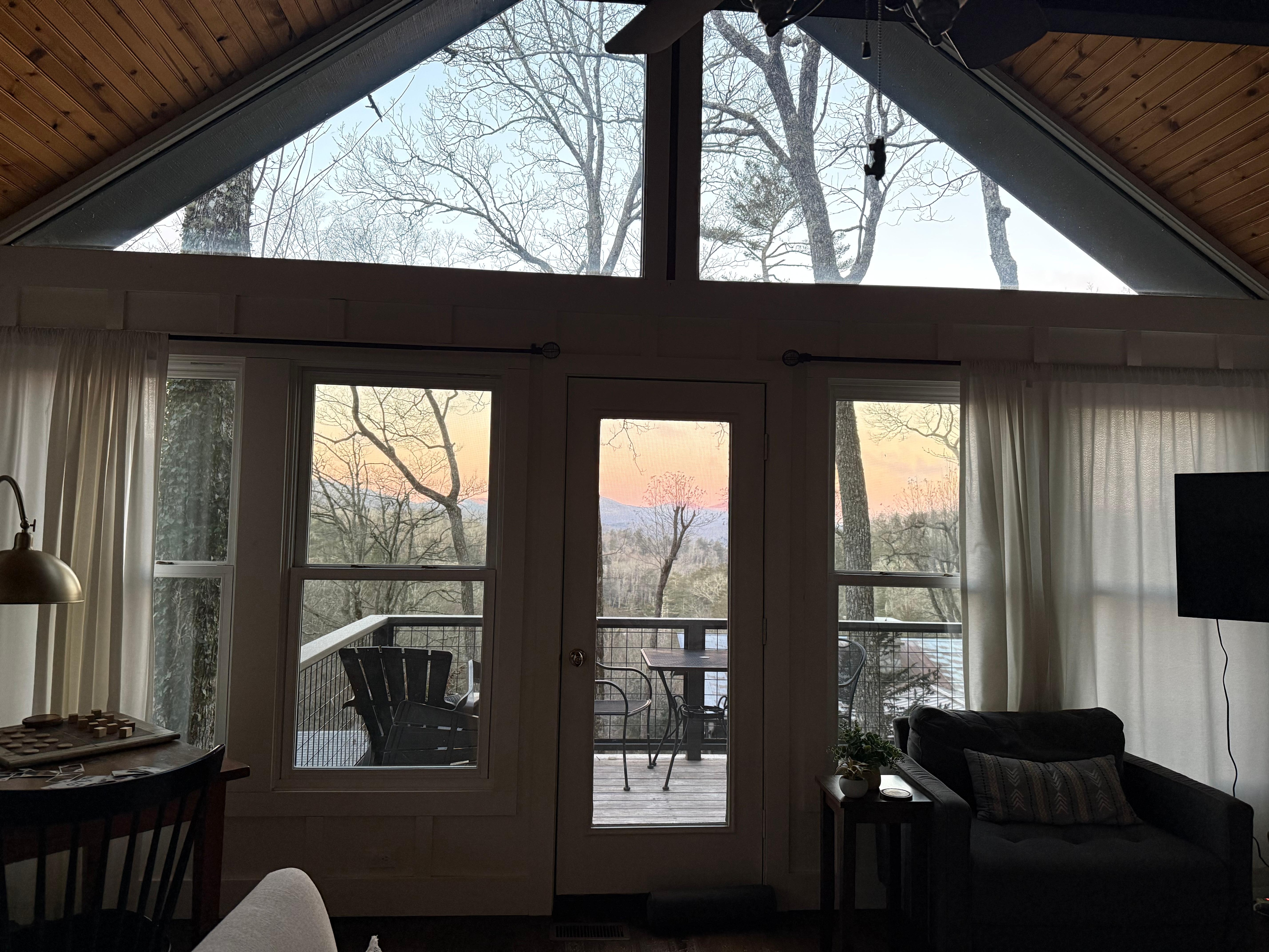 The main level features two Queen bedrooms, each with a full bath. One bathroom has a stand-up shower, while the other includes both a tub and a shower. The open living area boasts vaulted ceilings, natural light, a stone fireplace, and stunning mountain views. It flows into the dining area and a kitchen that blends rustic charm with modern touches, while large windows invite the outdoors in. The elevated decks face west, providing perfect sunset views, and the screened porch is ideal for late-night conversations.