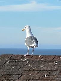 Upstairs, the great room takes full advantage of the ocean views with large windows on all sides and a sky-high deck with a barbecue through double French doors. A huge trestle dining table seats 8+, and a contemporary grey sectional lets you kick back and watch the huge TV in comfort. The stand-out gourmet kitchen sports a giant quartz island with seating for 4, a gas range, a farmhouse sink, and updated stainless appliances. The vaulted ceiling of this spacious room opens it to the sea and sky for a luxurious and relaxing time with your guests.