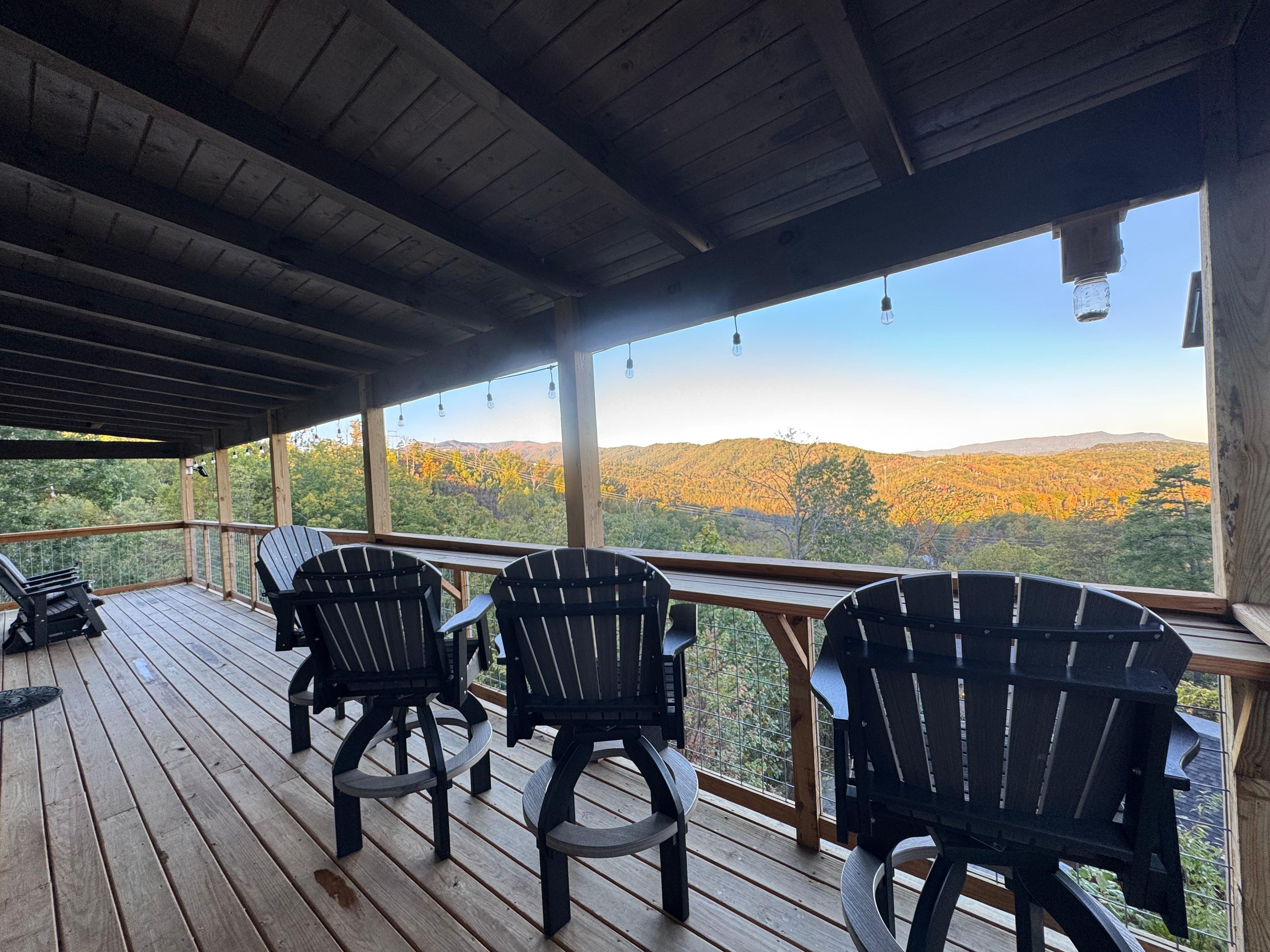 OUTDOOR LIVING: Private deck w/ high-top bar seating, mountain views, dining area, private hot tub, charcoal grill