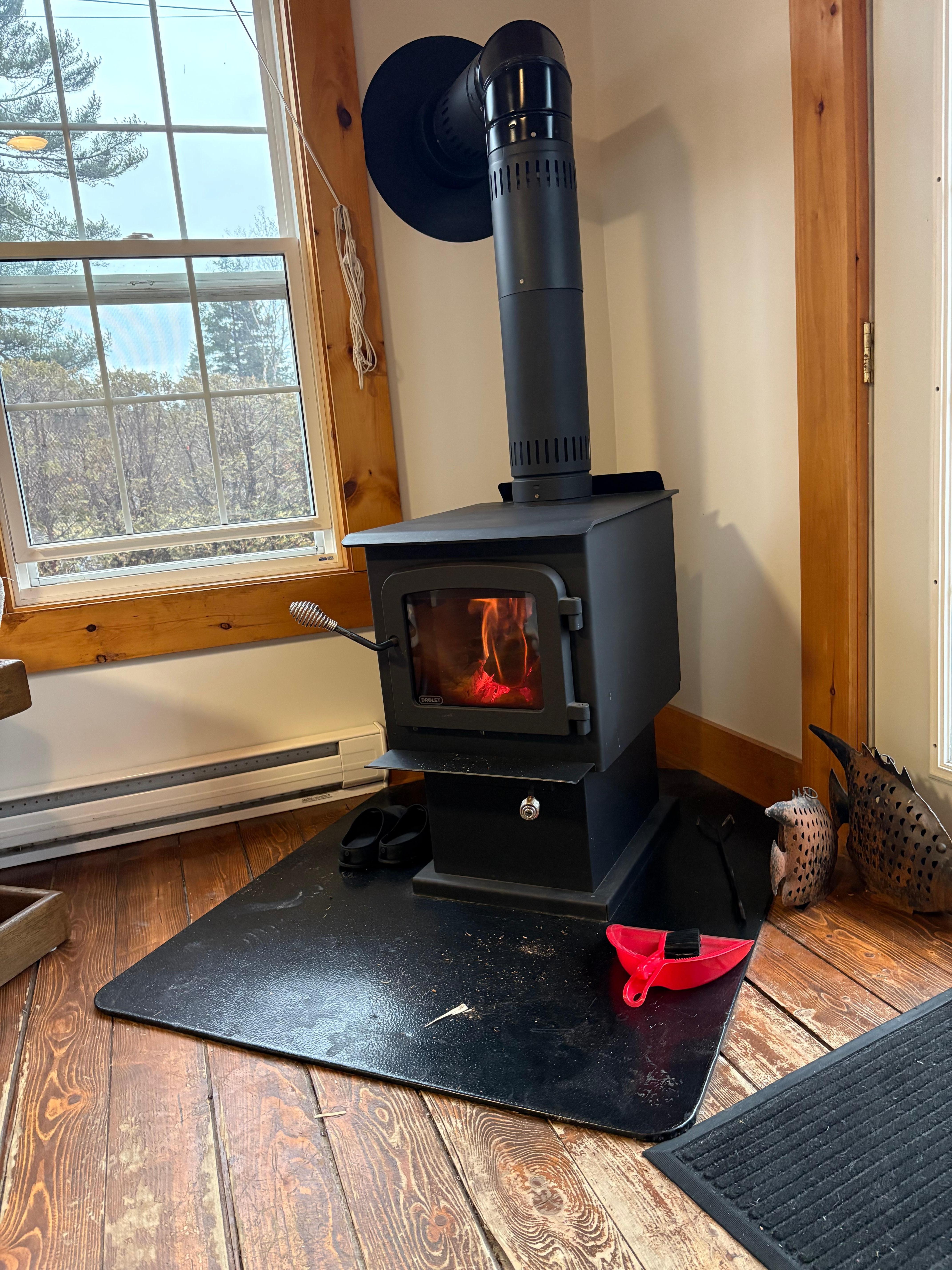 Inside, the cottage features an open-concept living and dining area with large windows that bring in natural light and connect the space to the water outside. A wood-burning stove adds warmth and a cozy coastal atmosphere throughout the year.