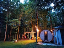 ✦ Outside, there is a terrace with furniture and a breathtaking view of the forest, a propane BBQ, a spa and a sauna which are open during the 4 seasons, not to forget a large area with an included playground where your dog and kids can stretch their legs!