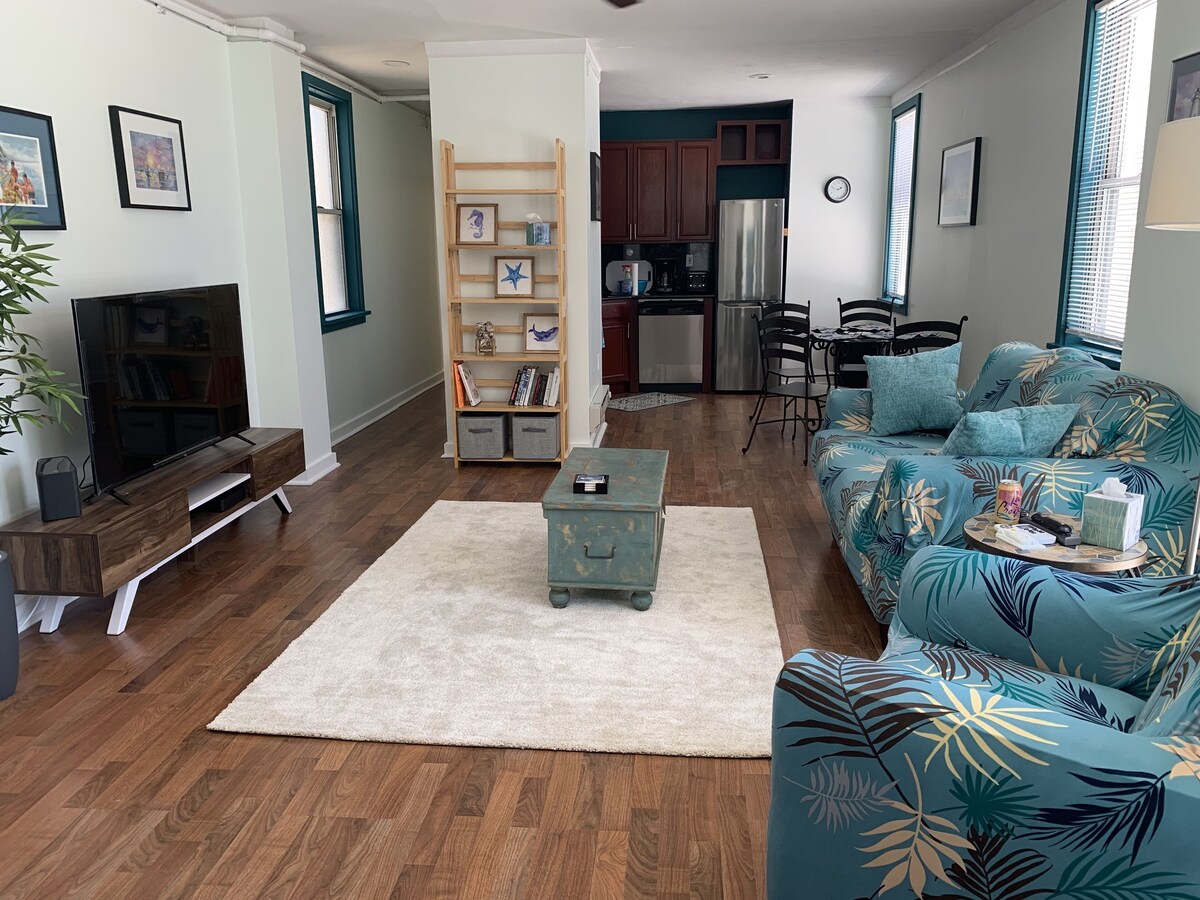 One block to the AC beach and historic Boardwalk. Food, fun, entertainment, and fresh salt air.