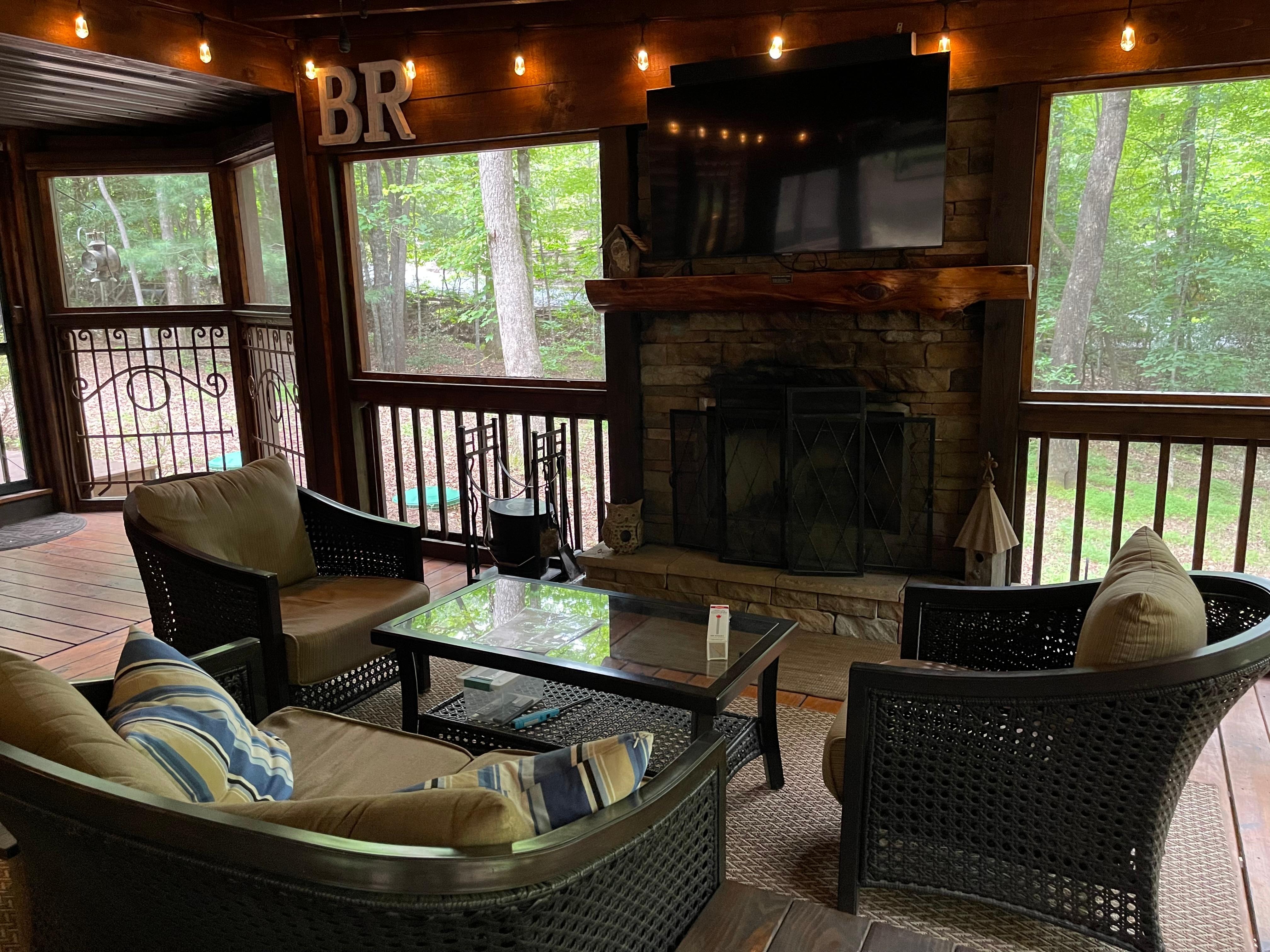 Outdoor - covered front porch wraps around to screened-in main level deck, wickers chairs and ottomans, side table, lamp, rug, gas grill; balcony; downstairs screened-in deck, stone wood burning fireplace, 55” Smart TV, 2 chairs, side table, lamp, high top table, 4 stools, rug, 4 Adirondack chairs, side table, wicker loveseat and chairs, coffee table, side table, ceiling fans, ceiling lighting, hot tub seats 5