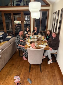 The kitchen table seats 8, making it a comfortable space for meals together after a day on the mountain.