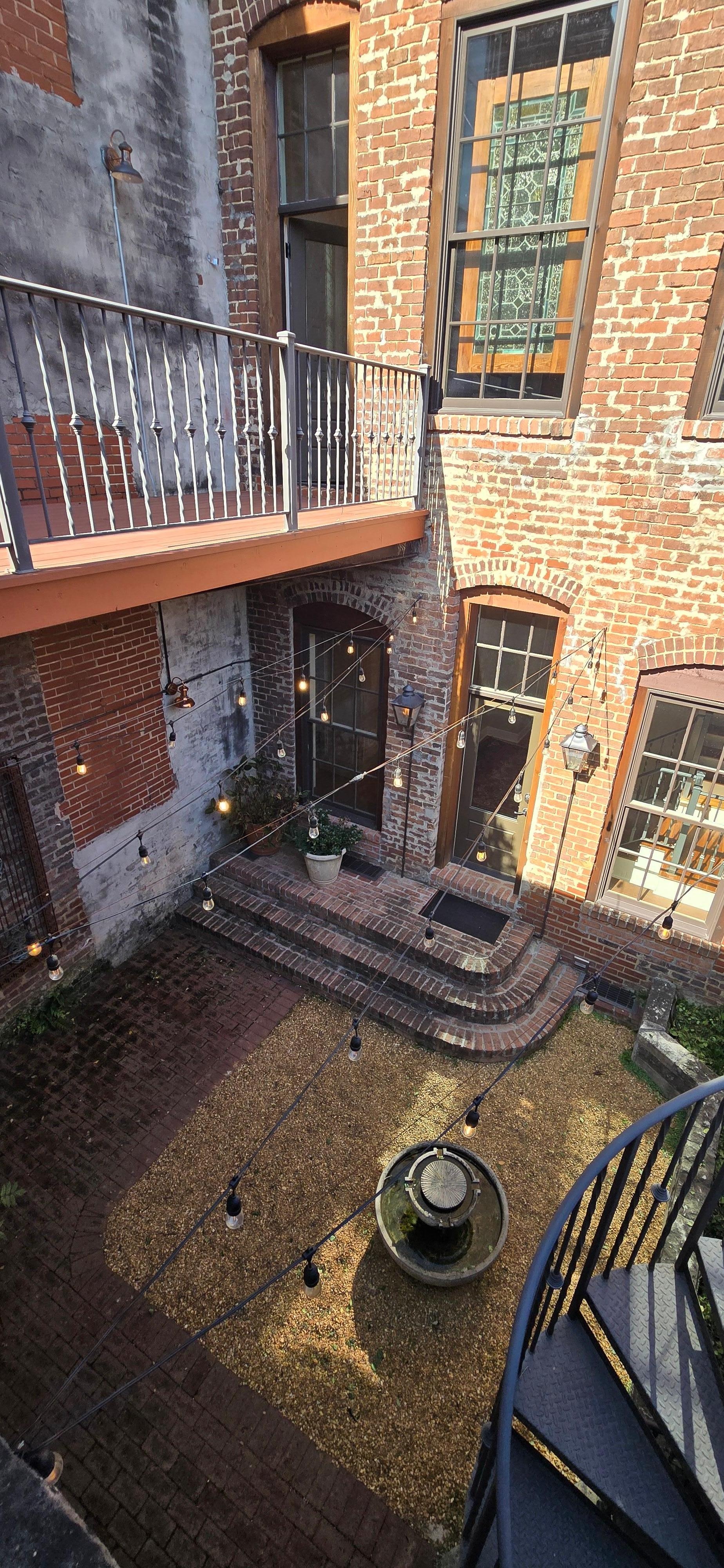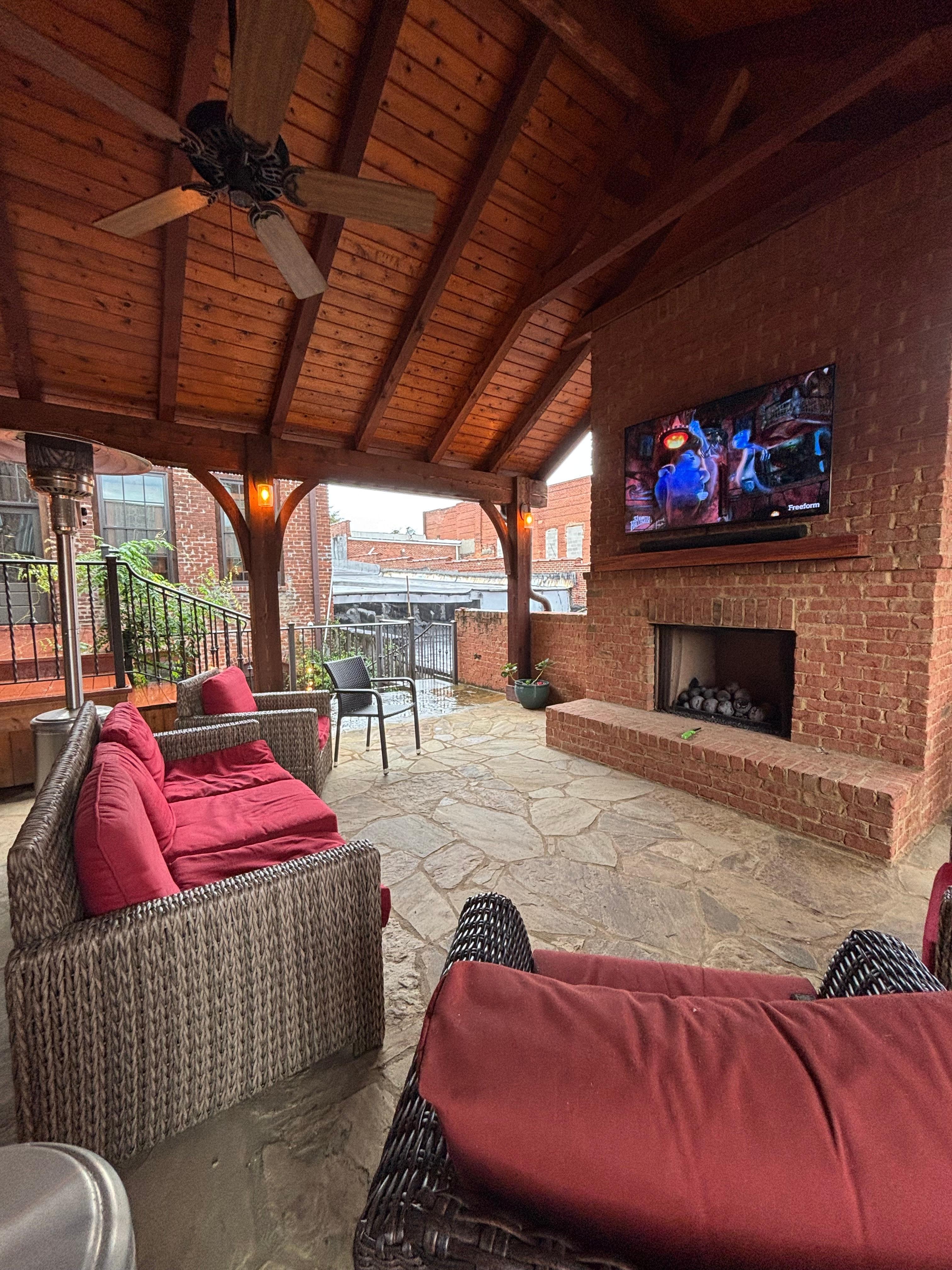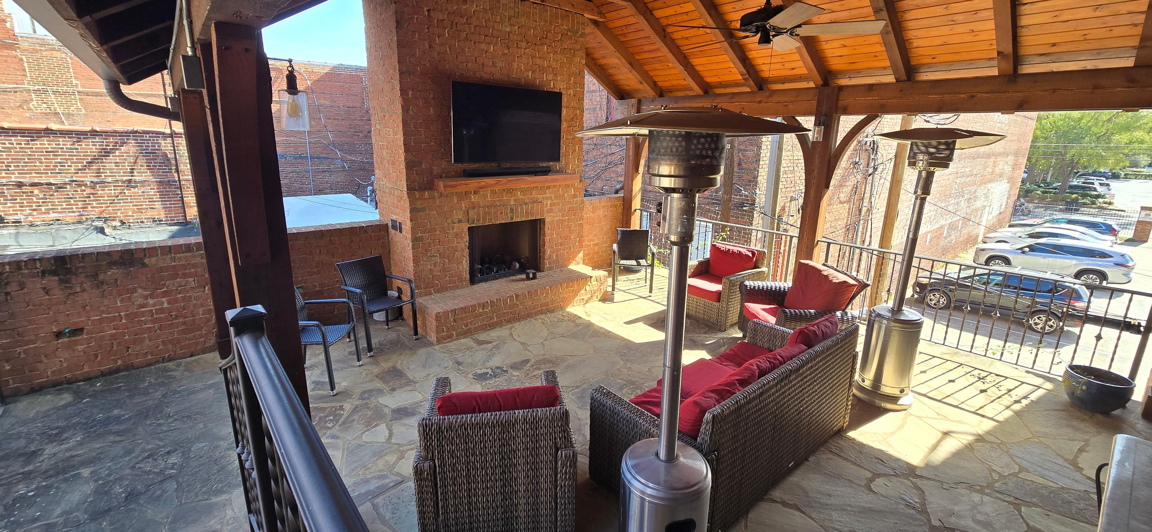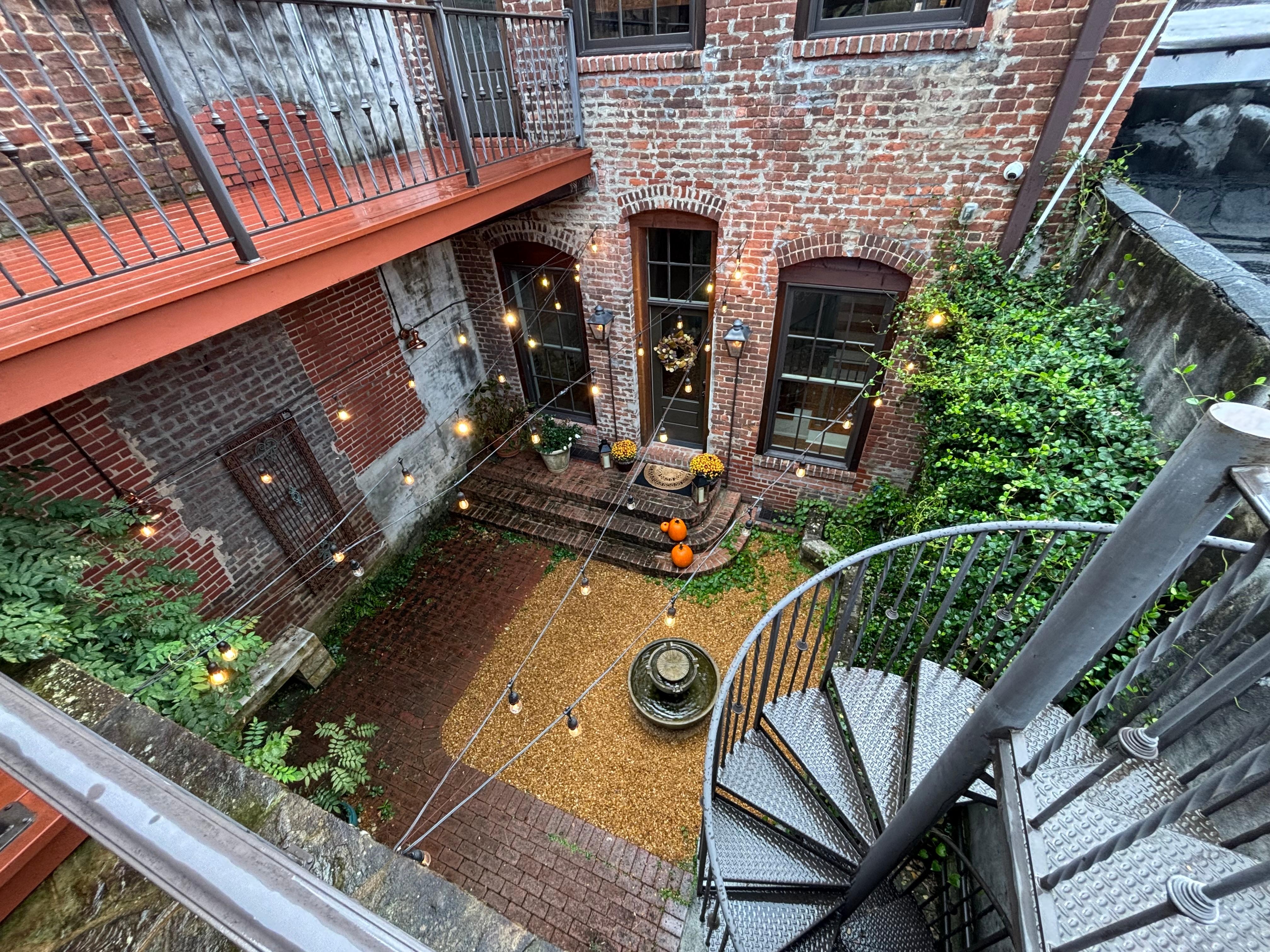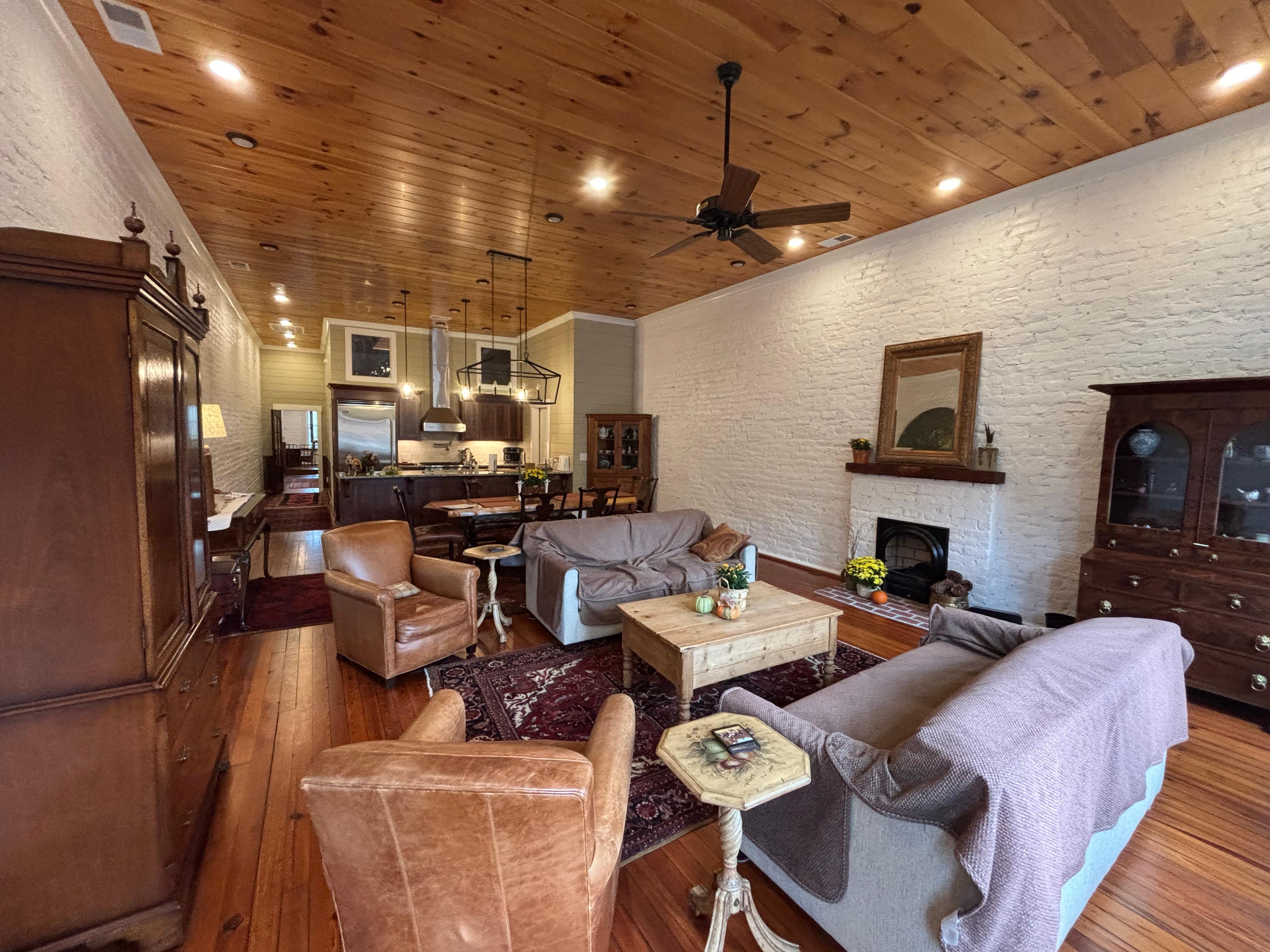 There are 3 separate living areas: The first is the forward living room facing Broad Street. This space is open to the dining area and an open galley kitchen; The second, is at the rear of the loft. There is a spiral staircase from that area up to the bunk bed rooms which are suspended above the rear living room. Third, is a covered cedar cabana over the garage with a gas fireplace.