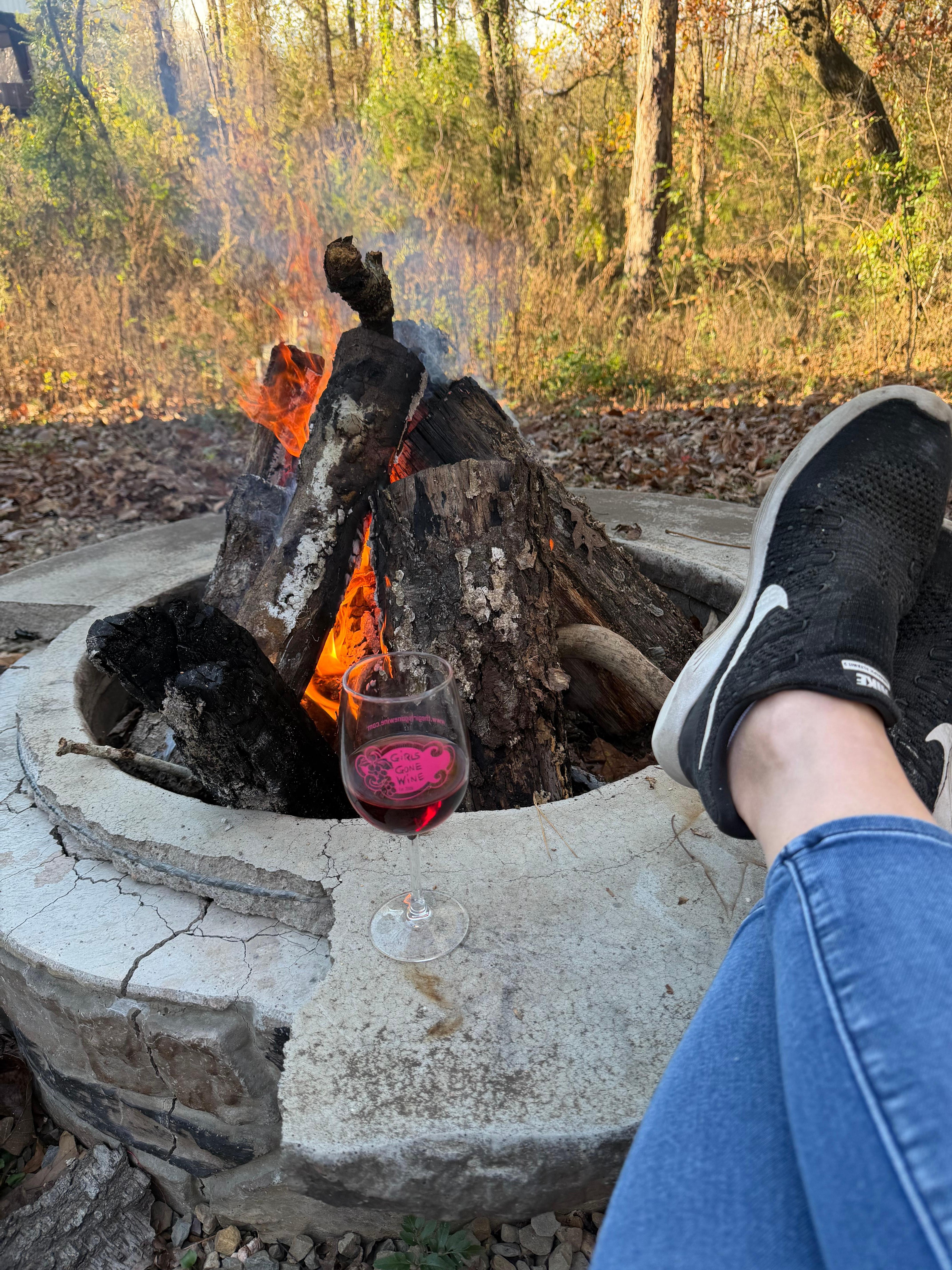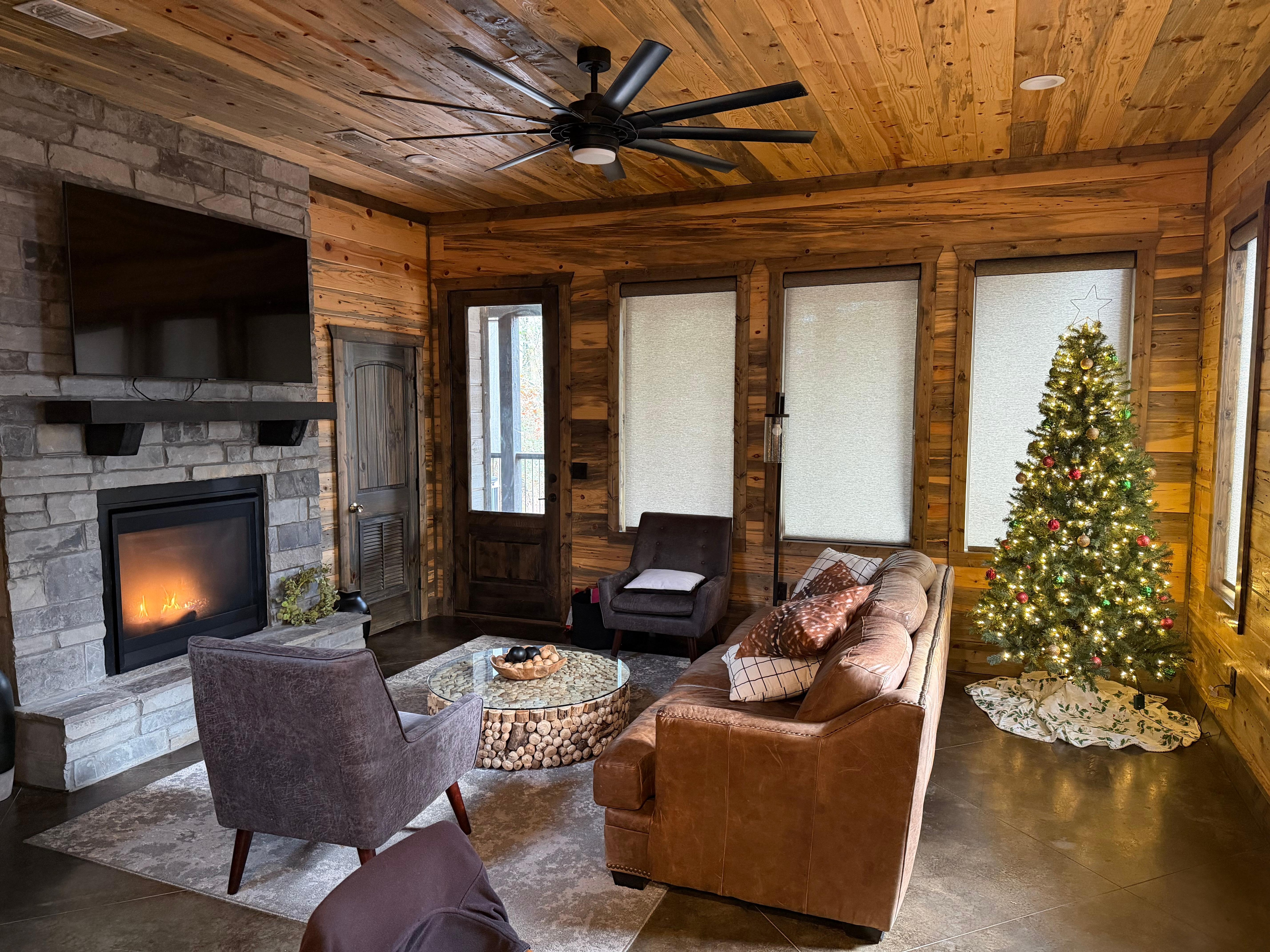 What sets Champagne Bliss Cabin truly apart is its quirky amenities. The large covered sitting area outside includes comfortable patio furniture and a smart 65” 4K TV for entertainment pleasure. The gas-burning fireplace will help keep you warm and cozy as you bundle up for a chilly night. There is also a large hot tub, gas grill (propane tank provided), and a fire pit to make the experience underneath a star-studded Oklahoma sky even more special.